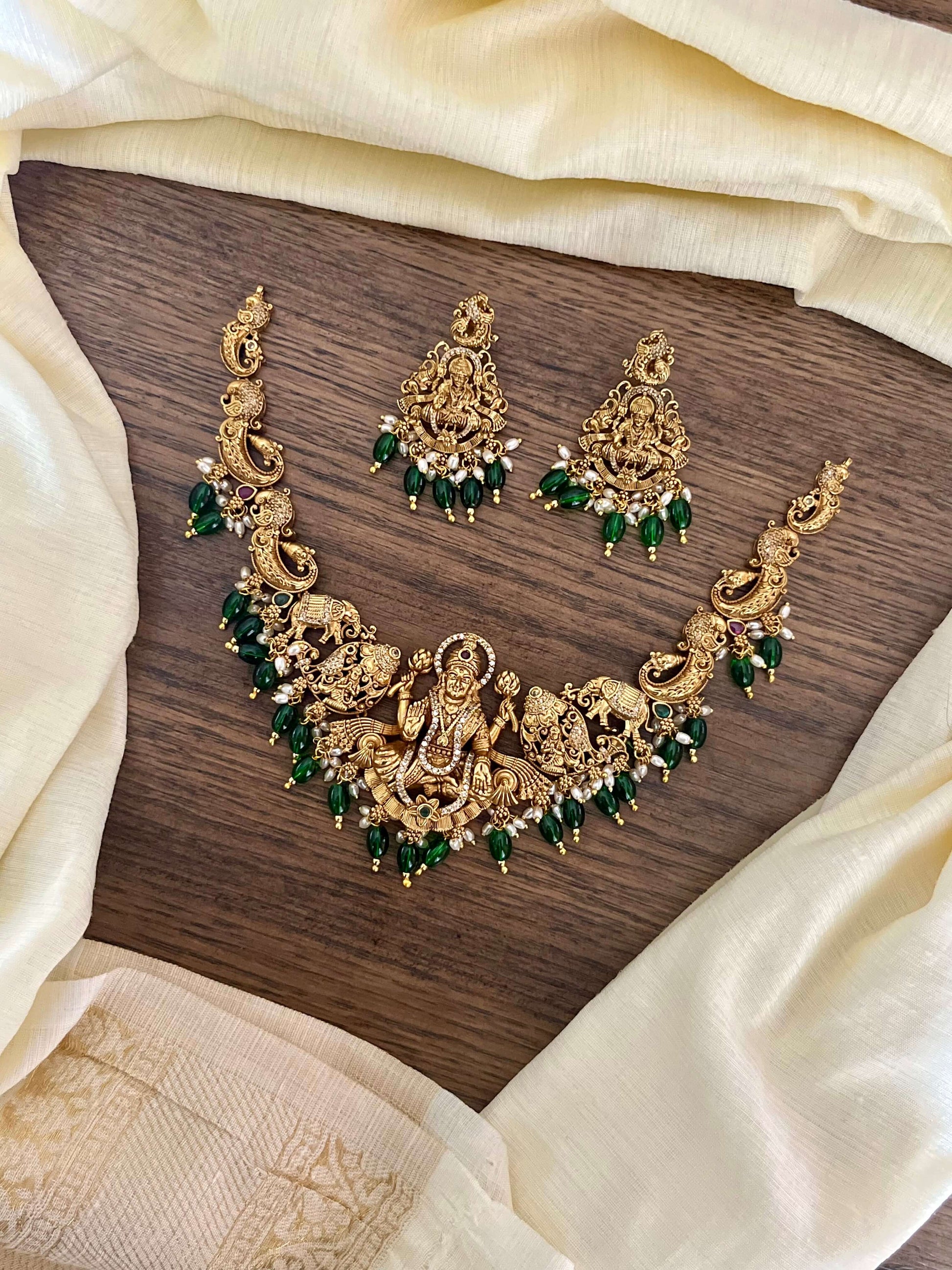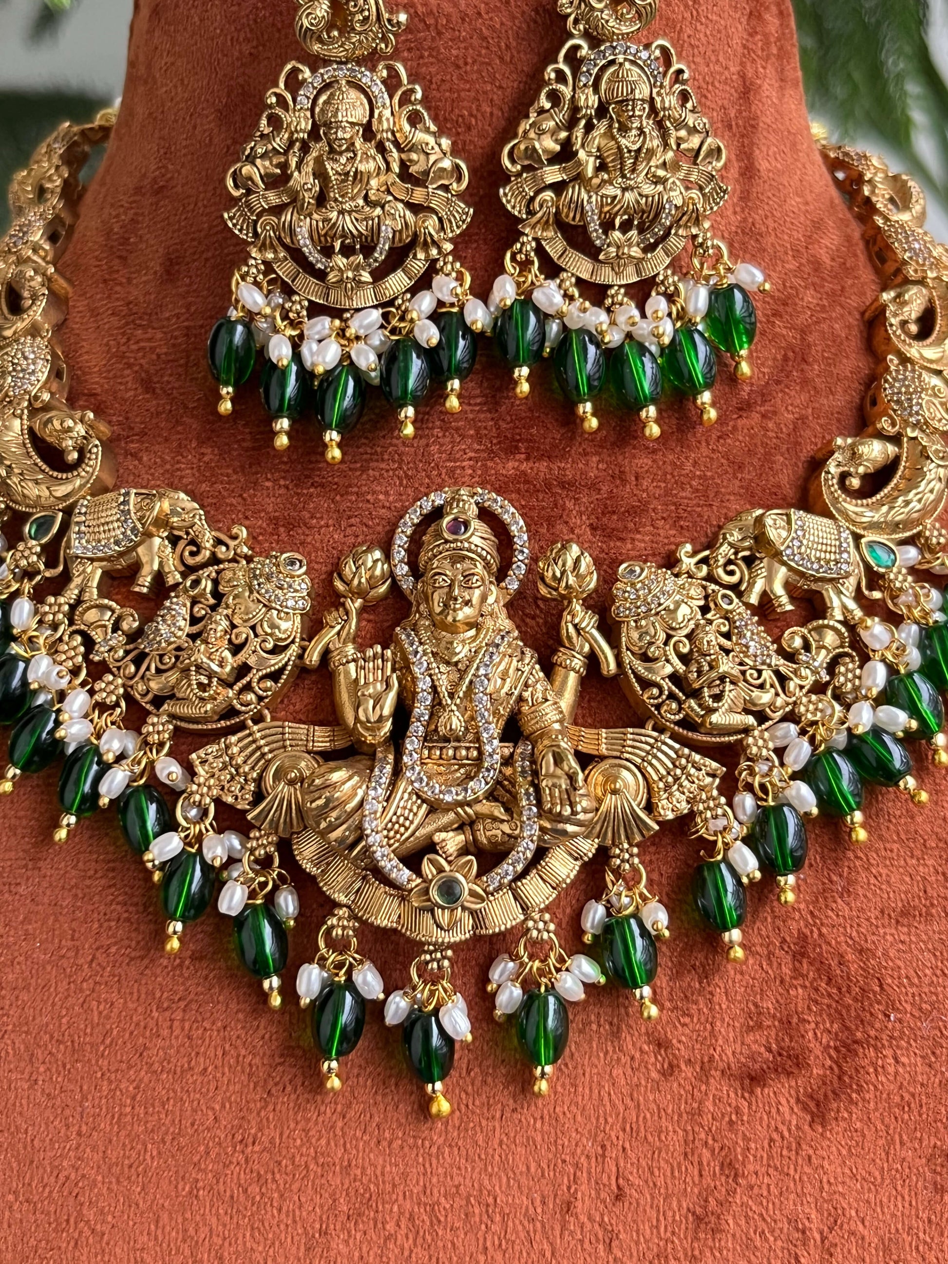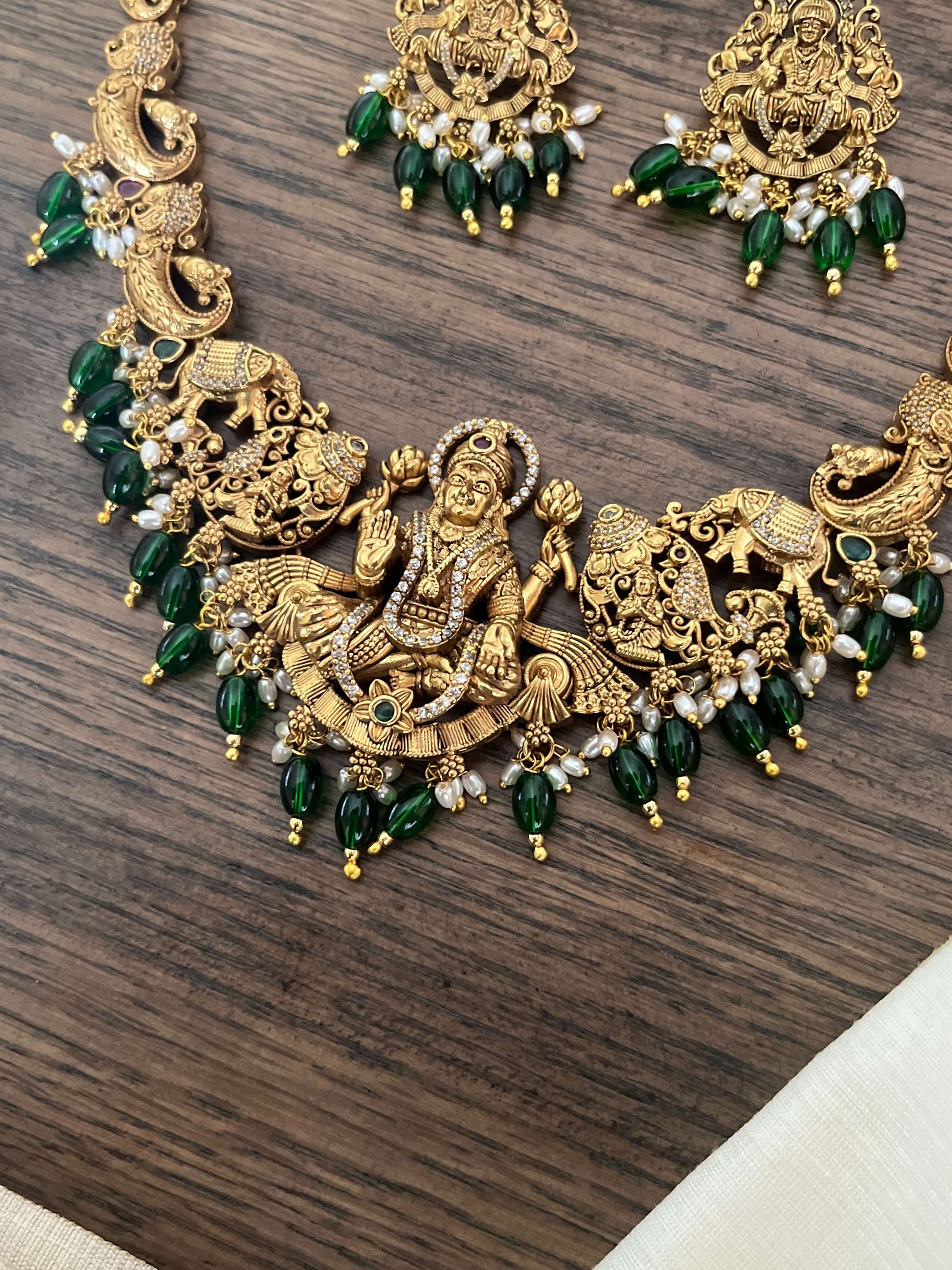3D Grand Lakshmi Devi Antique Gold Necklace Set with Temple Design & Green Beads