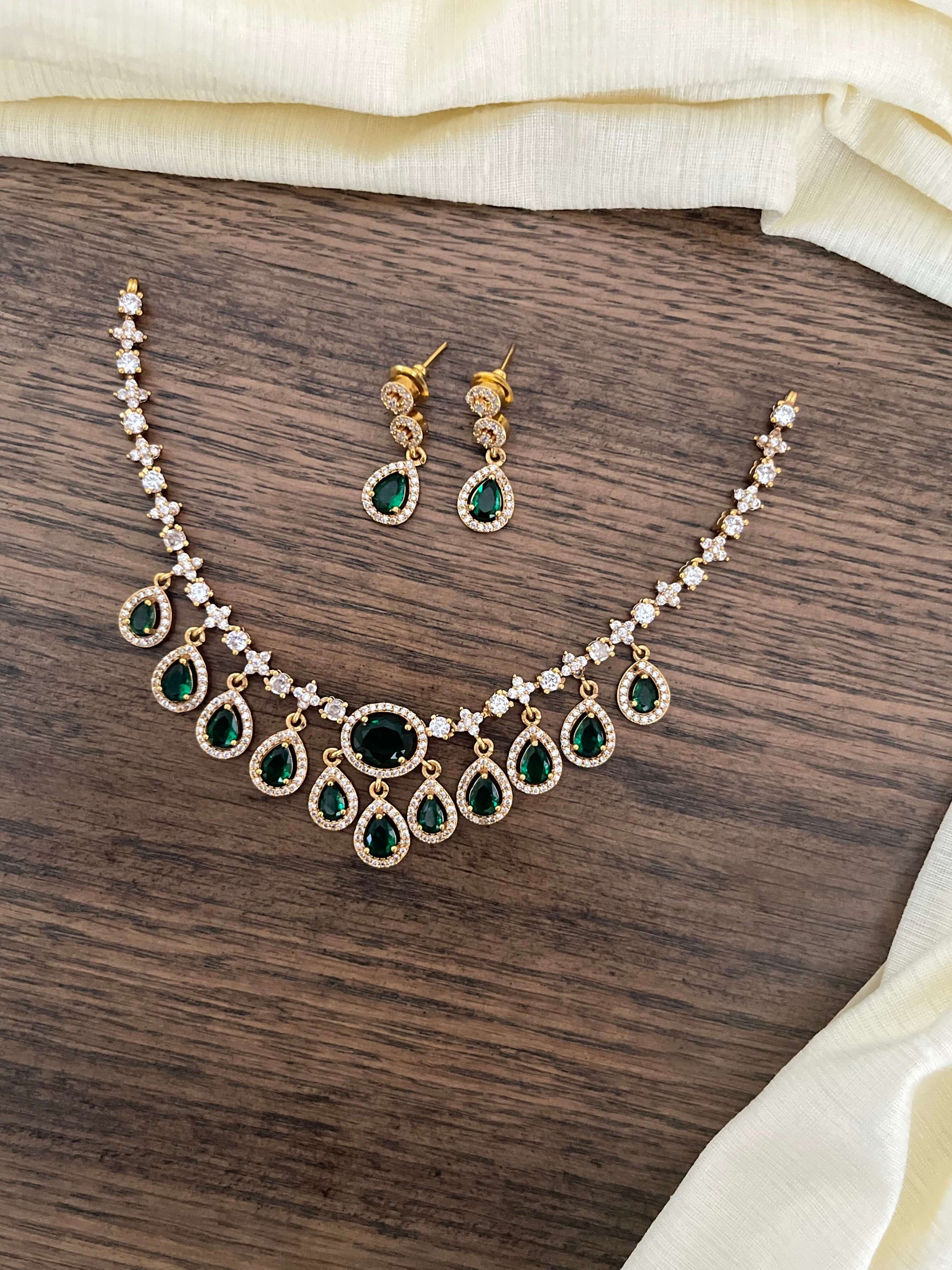 Elevate your look with this elegant AD Drop Necklace Set with matching earrings, crafted with sparkling American Diamonds and premium gold finish. The statement teardrop design adds timeless charm, making it perfect for weddings, parties, and festive occasions. Available in Green color, this lightweight yet luxurious necklace set blends traditional style with modern elegance. A must-have addition to your jewellery collection.