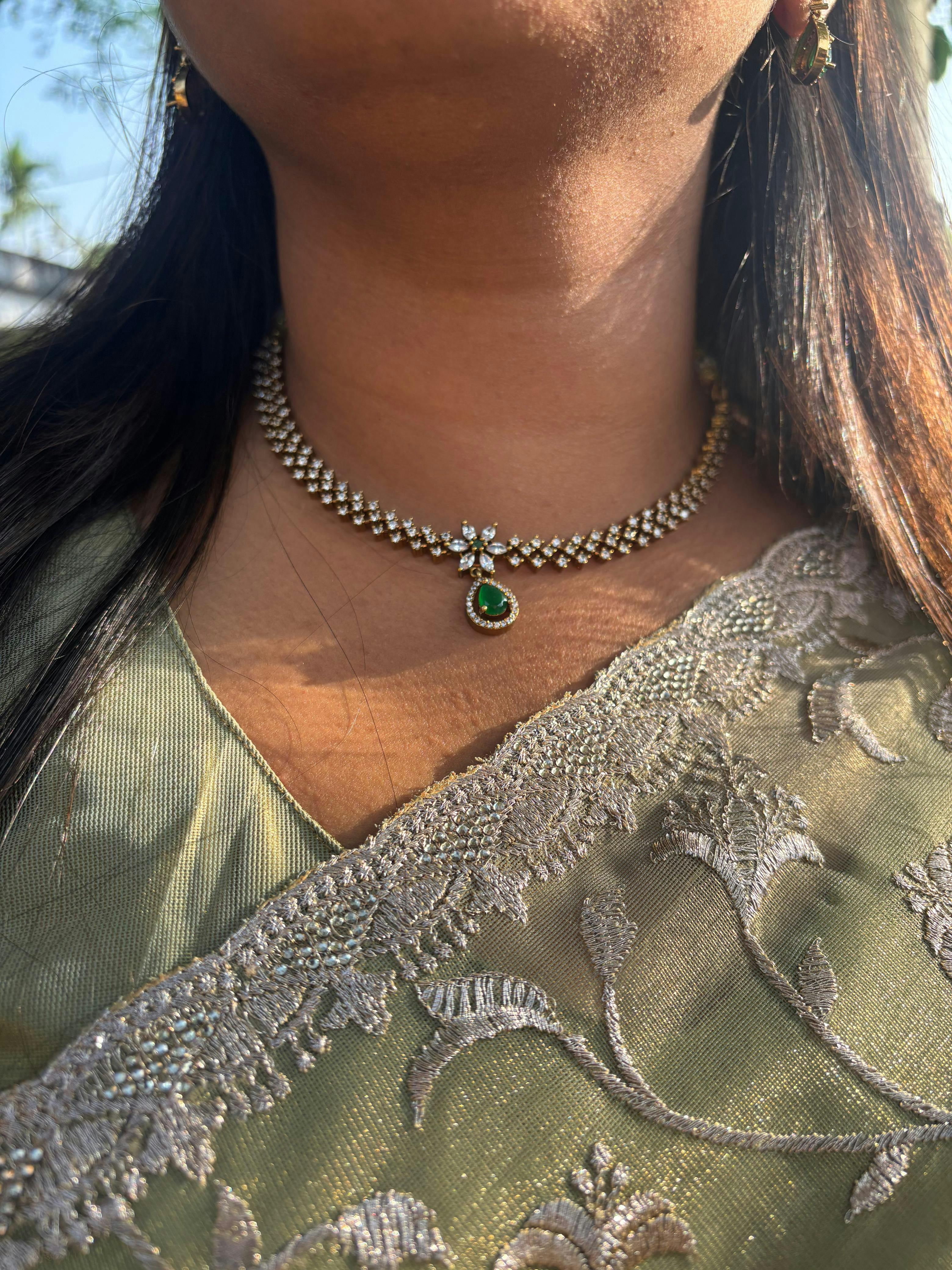 Elevate your style with this elegant American Diamond (AD) drop pendant necklace. The minimalist, slim profile sits beautifully with sarees and suits, making it perfect for festive occasions or as a thoughtful gift.