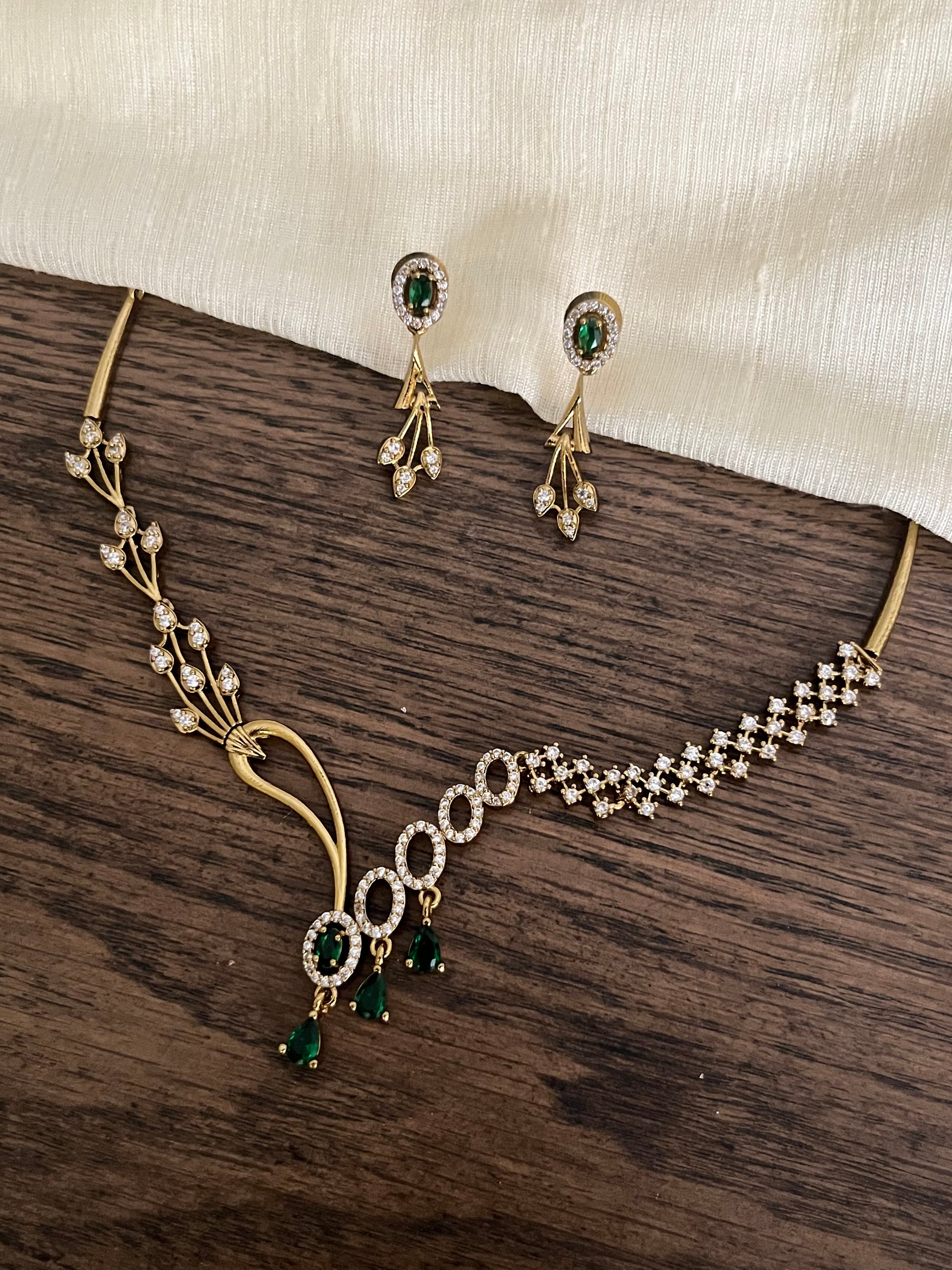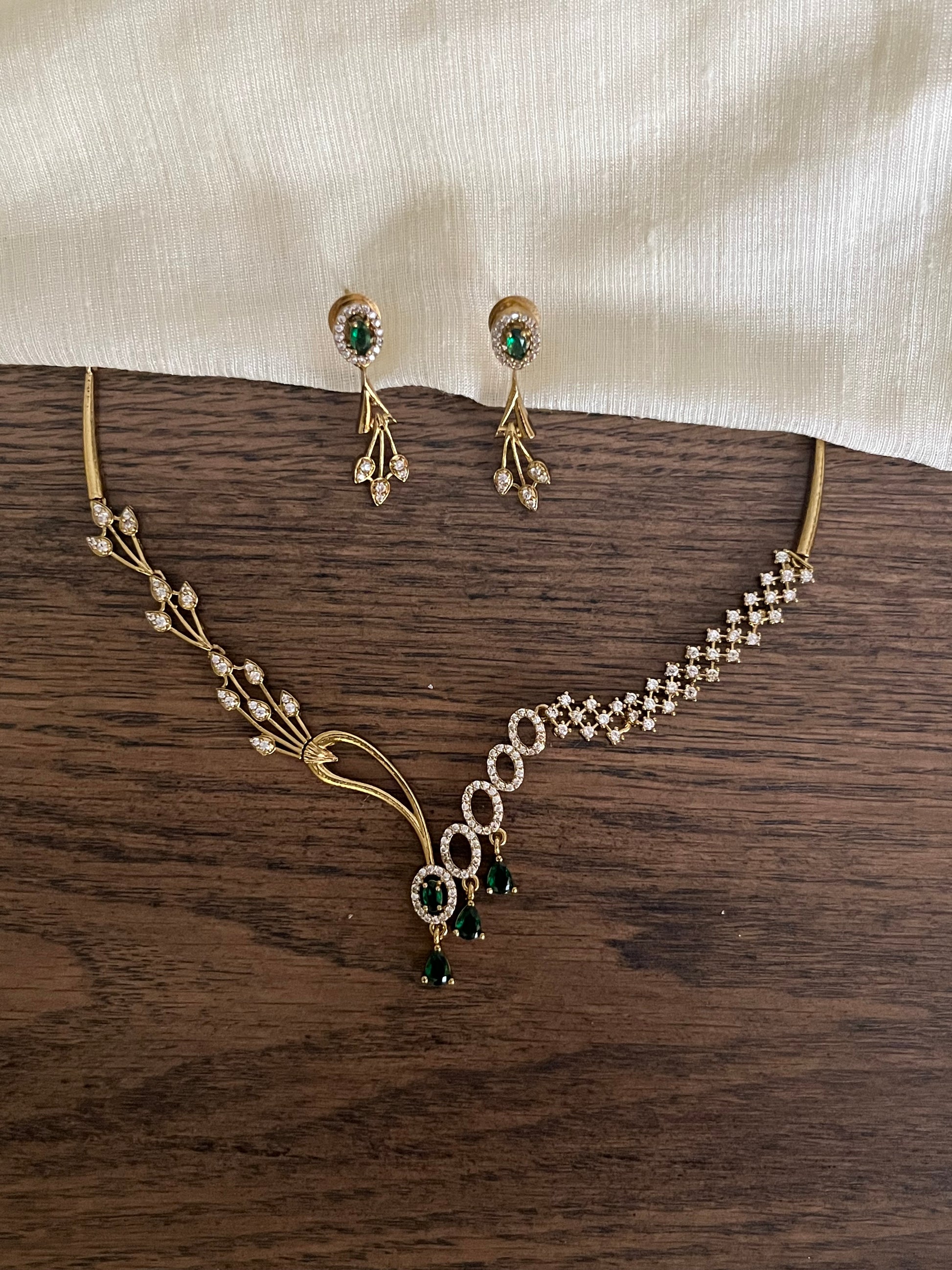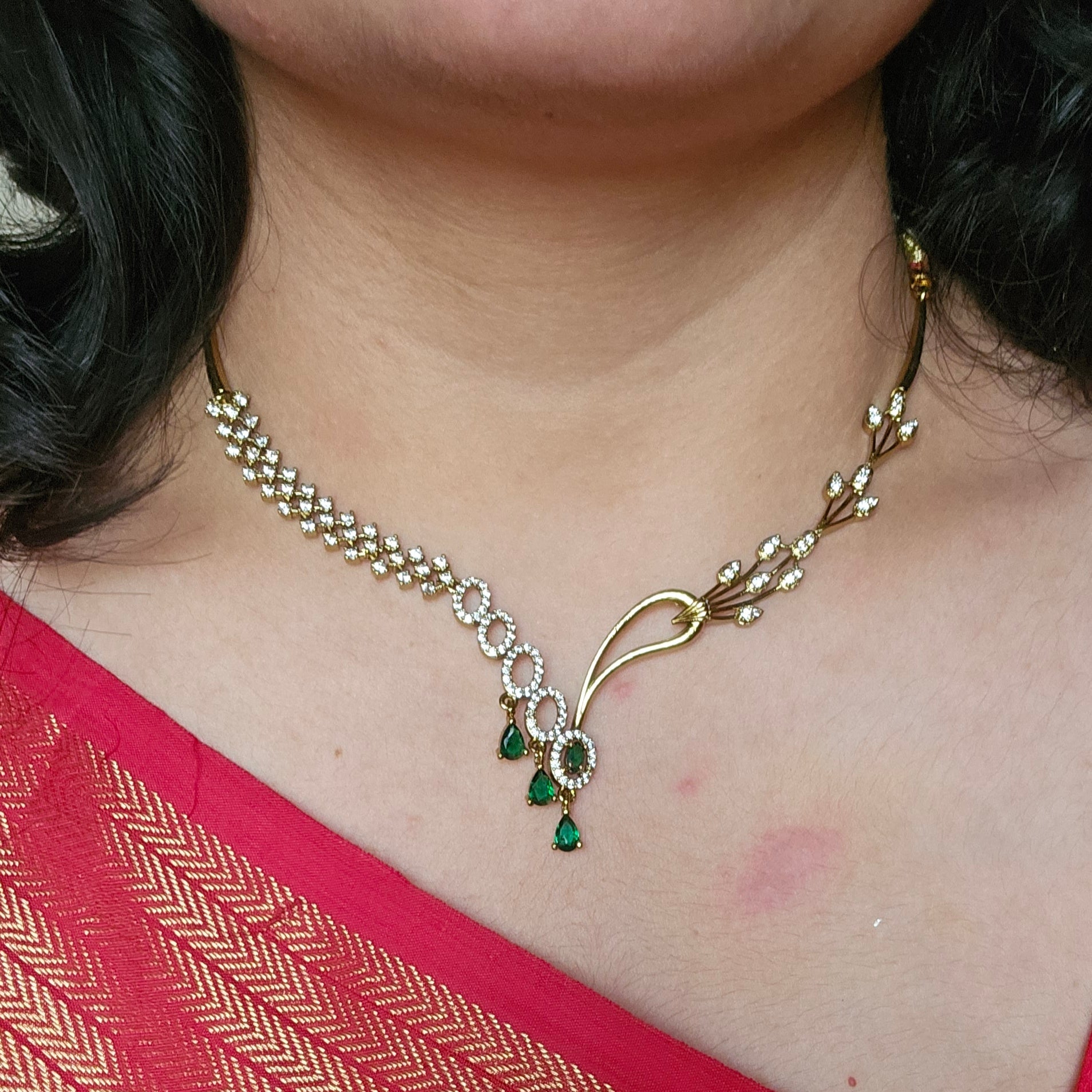 This asymmetric necklace features a bold, modern layout of green stones paired with sparkling artificial diamonds (AD), offering a fresh take on festive jewellery.