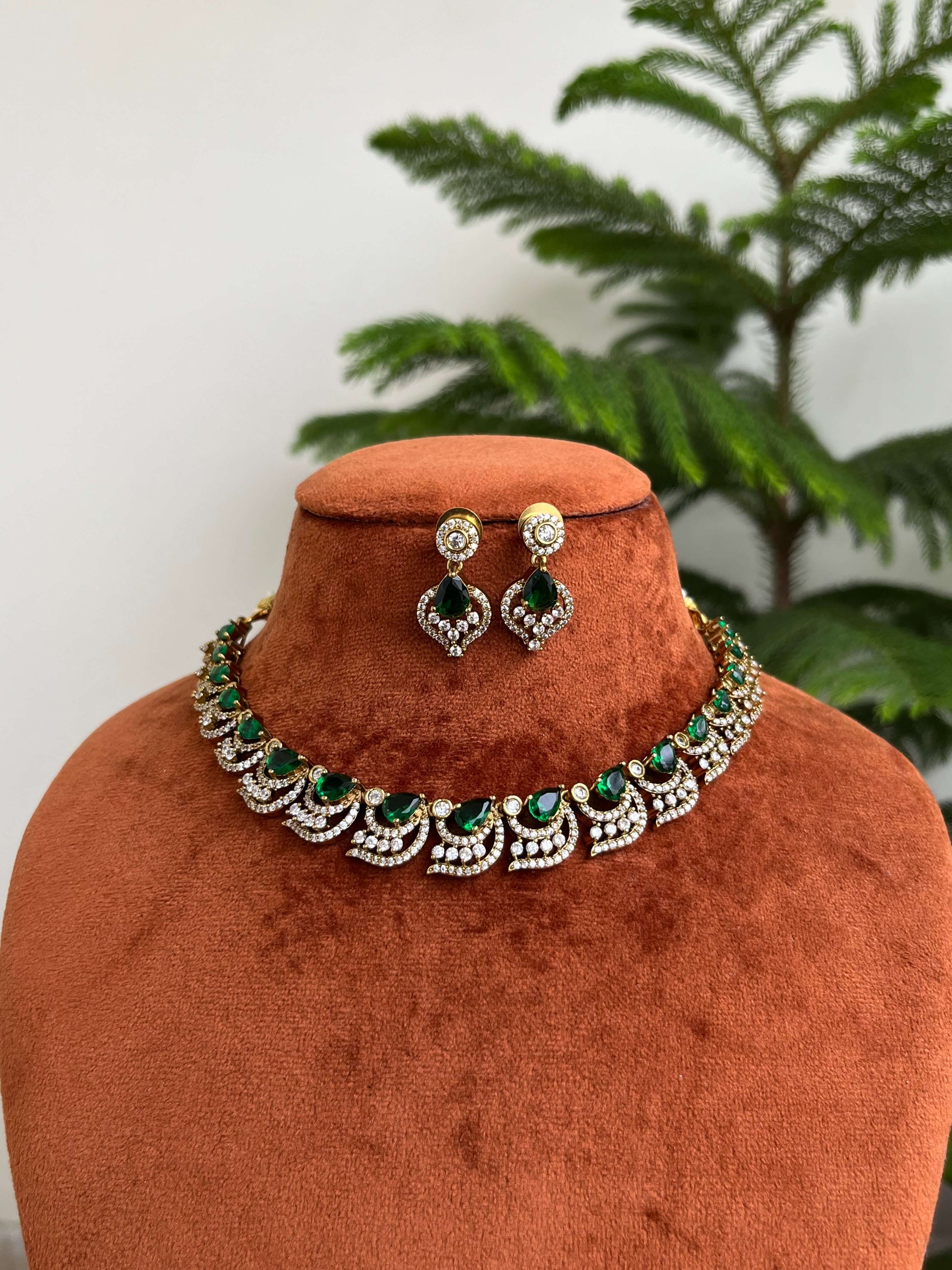 This Green & Ruby Stone CZ Necklace Set with Earrings is the perfect blend of luxury and affordability. The necklace is designed in a choker style with pear-shaped centerpiece stones (available in emerald green and ruby red) framed with sparkling American diamonds.