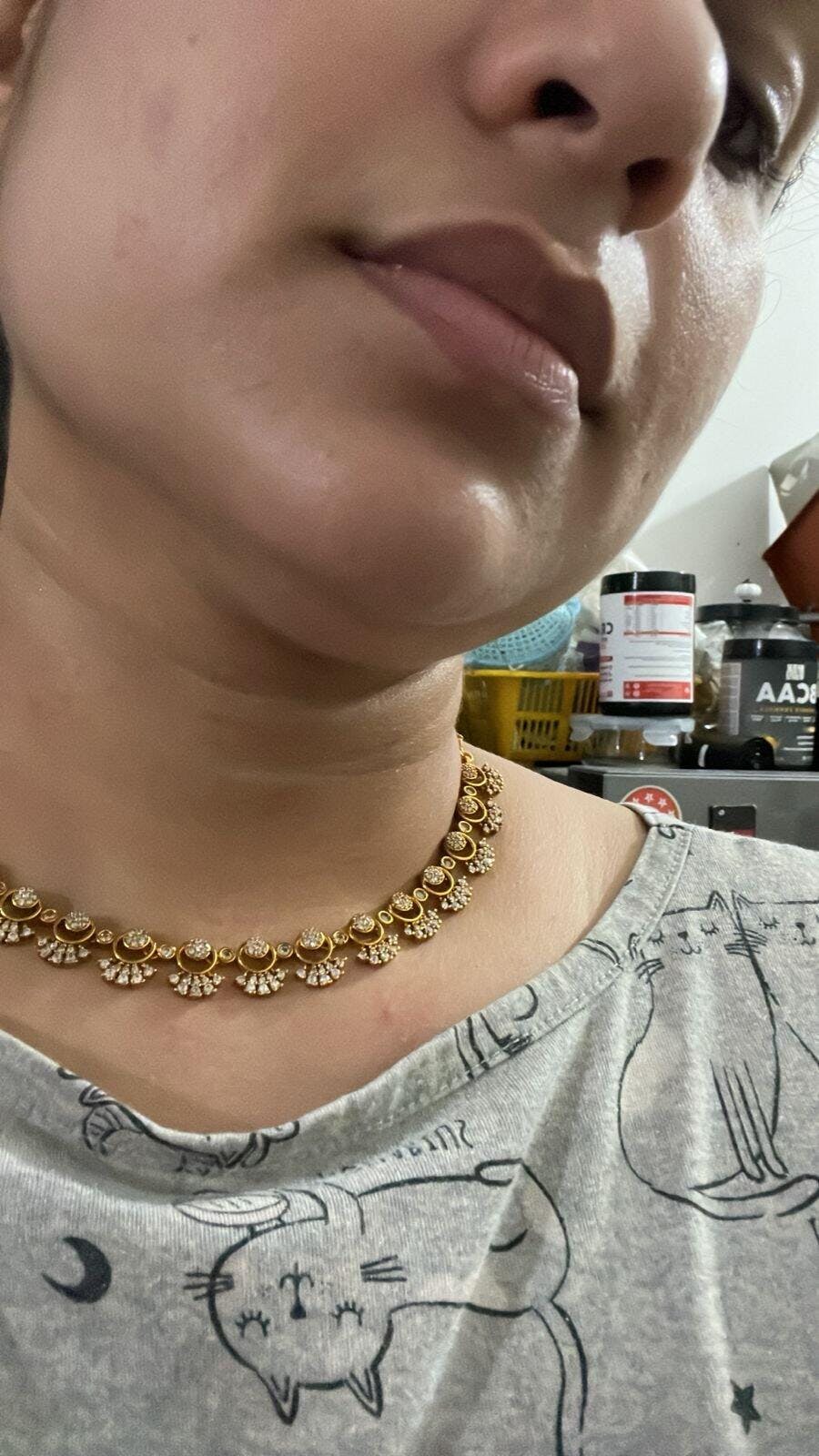 Add a touch of elegance with this small, sleek diamond look-alike necklace set. Perfect for non-bridal looks at weddings, receptions, or family functions. Its minimalist design complements both sarees and western dresses, making it a versatile piece for any wardrobe. Lightweight and trendy – a must-have for your jewellery box.