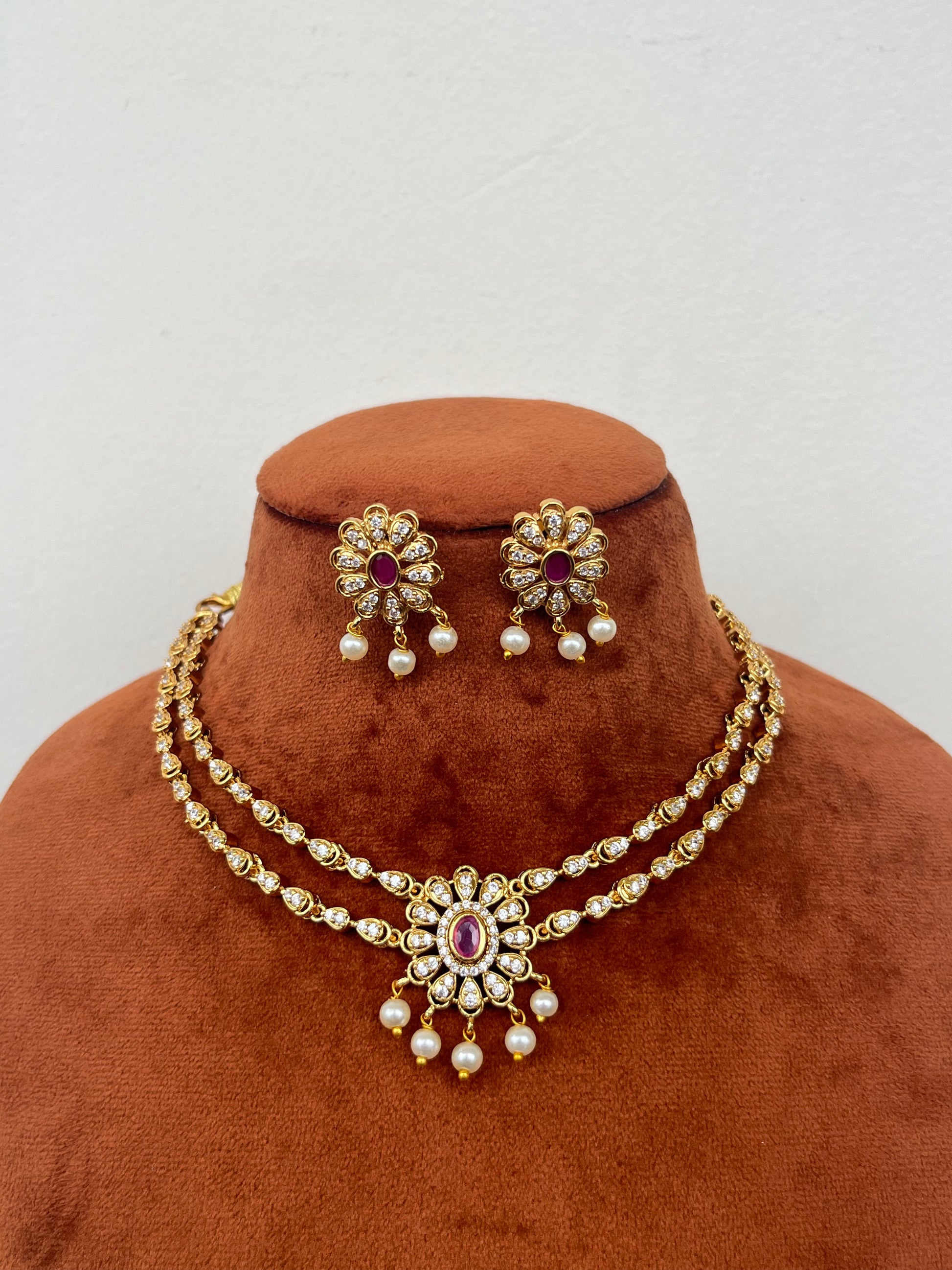 This traditional double-layer necklace features a central floral motif pendant, beautifully detailed with artificial diamonds (AD) and ruby or green stones for a regal ethnic look.