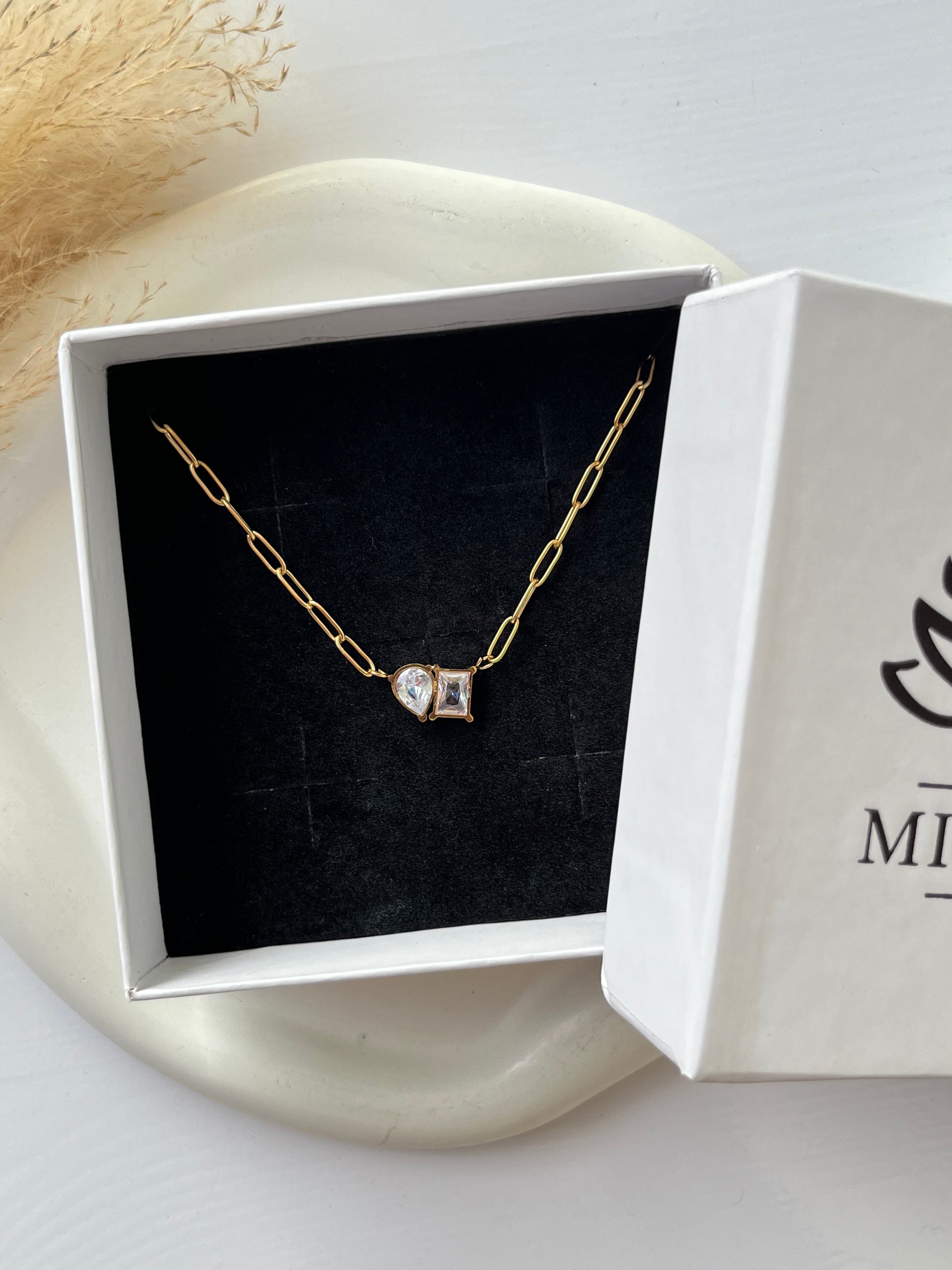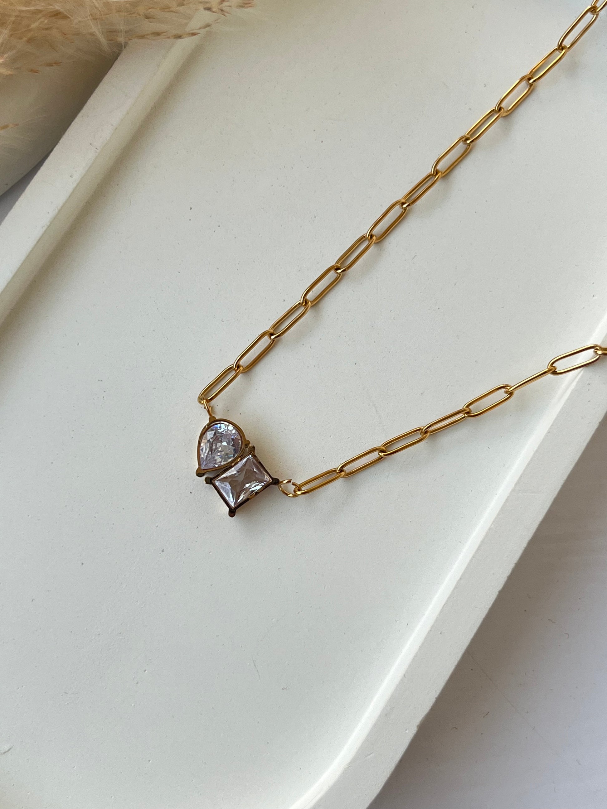 The Finley Necklace features a sleek drop and rectangular studded stone pendant suspended on a durable link chain. Crafted from 316L stainless steel, it offers superior resistance to tarnish and water, ensuring lasting shine and durability. Its hypoallergenic properties make it ideal for sensitive skin, combining expert craftsmanship with everyday wearability.