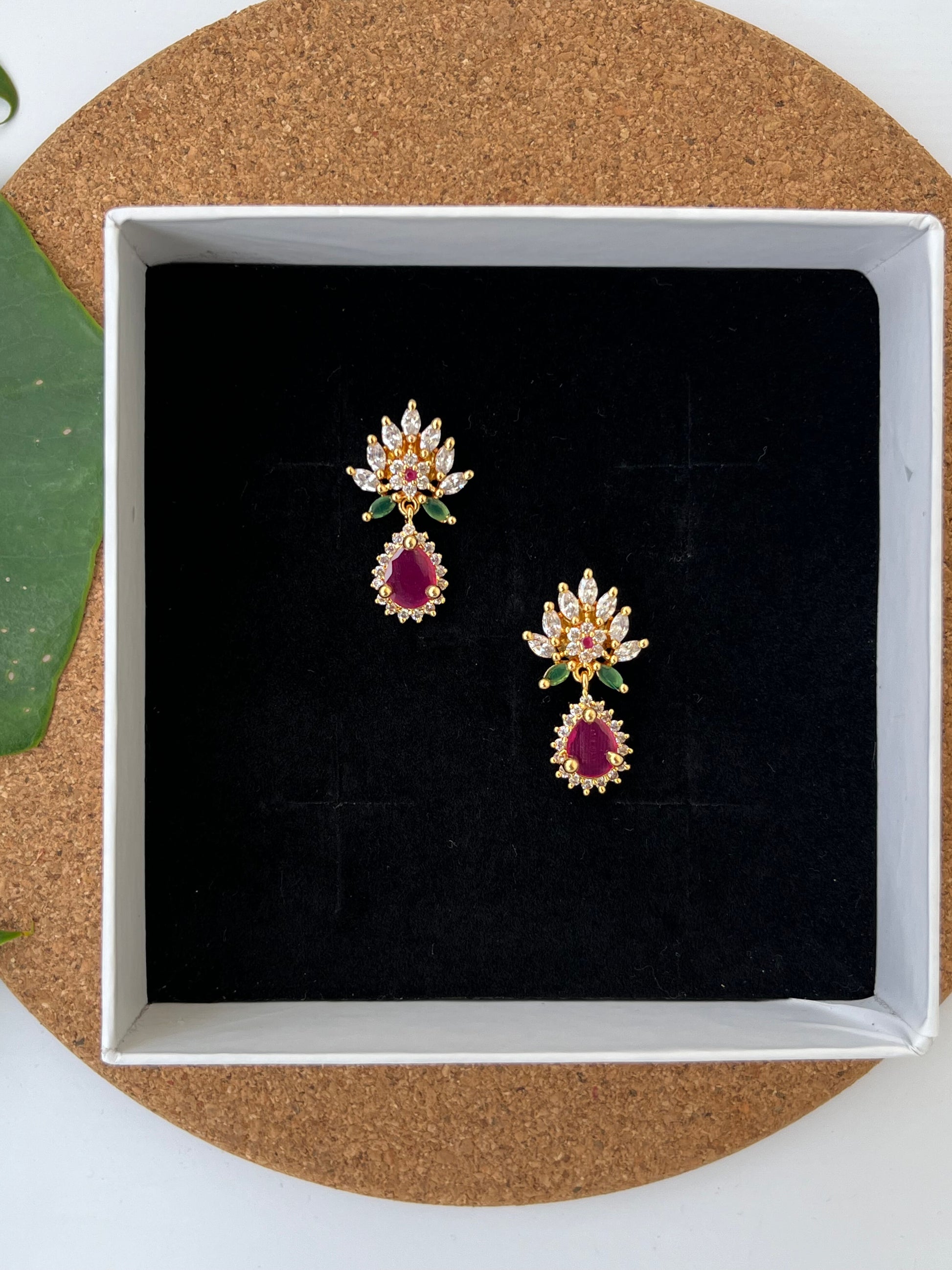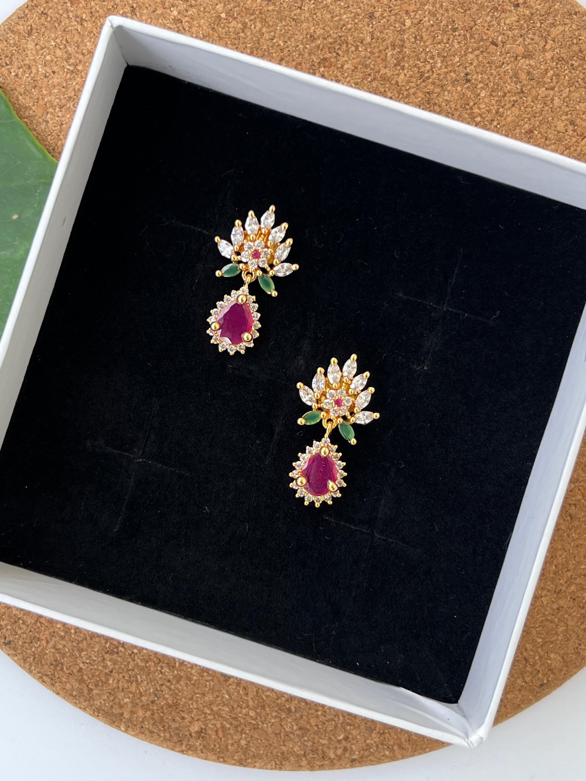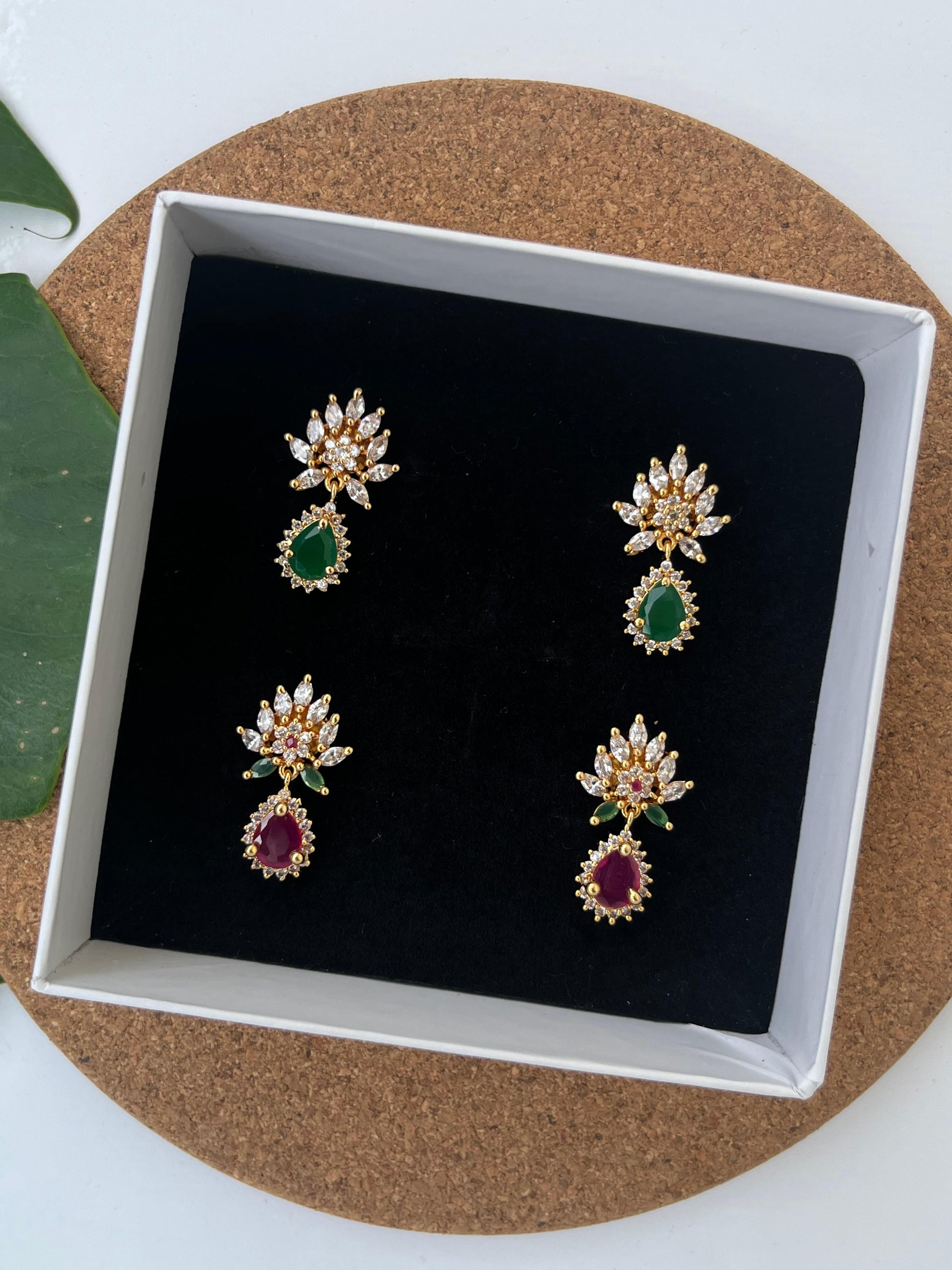 Add a sparkle to your everyday style with these affordable, gold look-alike dangler earrings. Featuring a floral stud design with dazzling CZ stones and teardrop-shaped green and multi-colored drops, these earrings offer the elegance of gold at a fraction of the price. Lightweight and versatile, they are perfect for casual wear, festive occasions, or gifting.