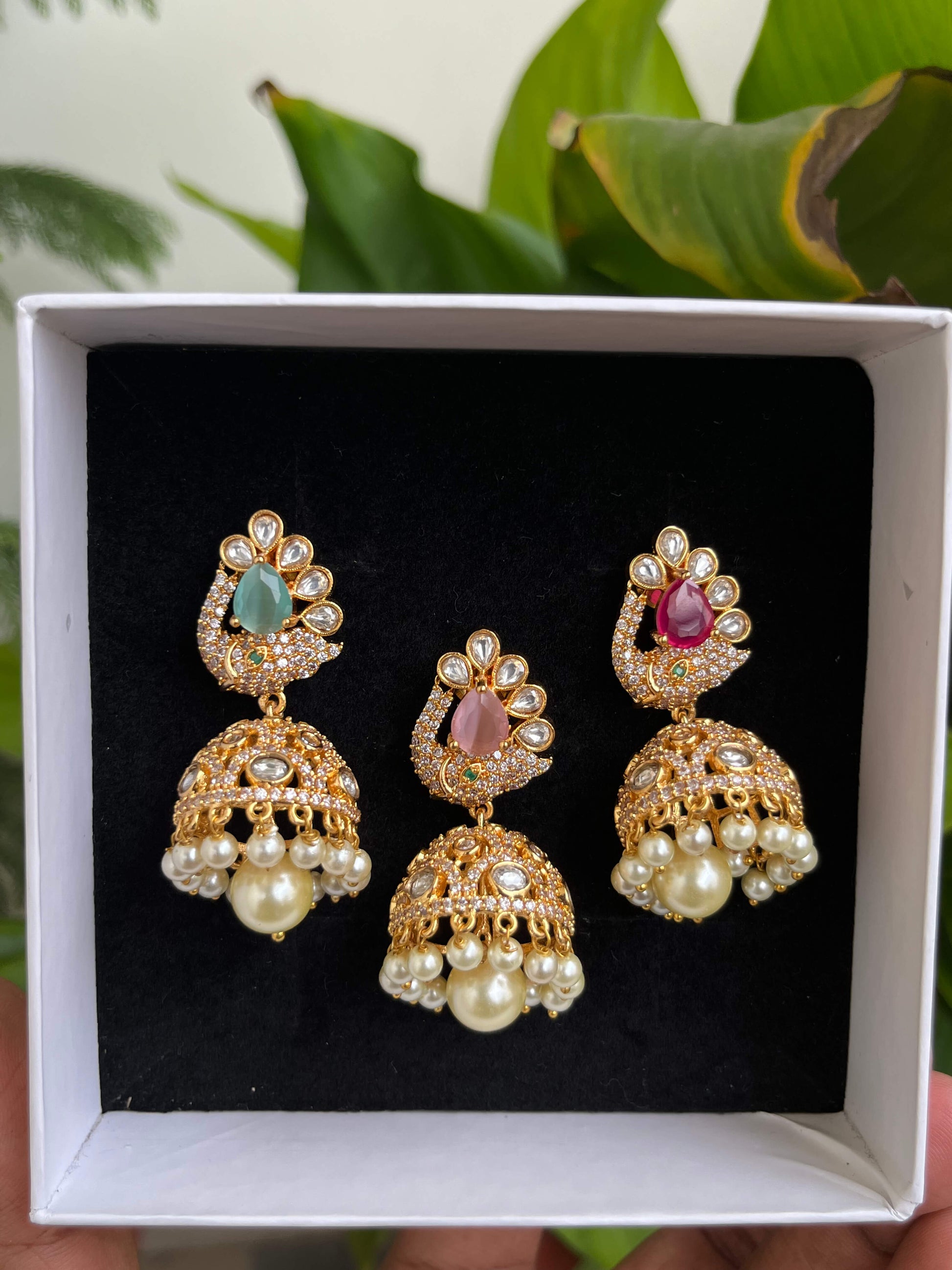 - Design: Teardrop stone top with CZ-studded jhumka and pearl drops