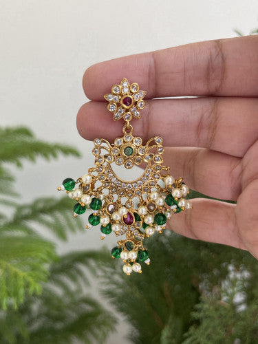 Elevate your elegance with this Green Beads and Pearls Chaandbali, intricately designed with delicate floral motifs. The harmonious blend of vibrant green beads and lustrous pearls creates a timeless accessory that complements both traditional and contemporary attire. Expertly crafted, this piece offers a refined balance of color and texture, making it an exquisite choice for special occasions or festive celebrations.