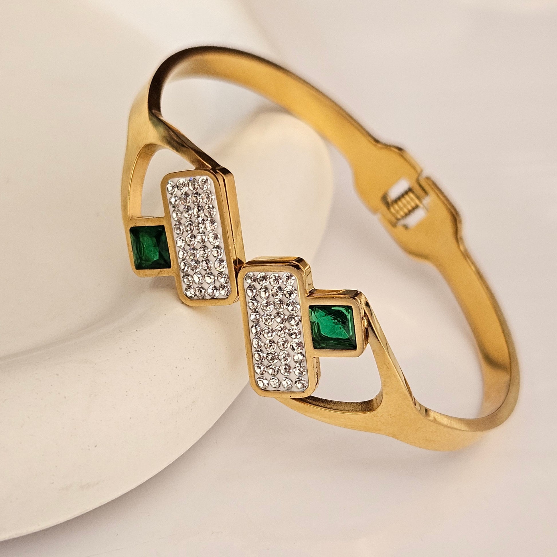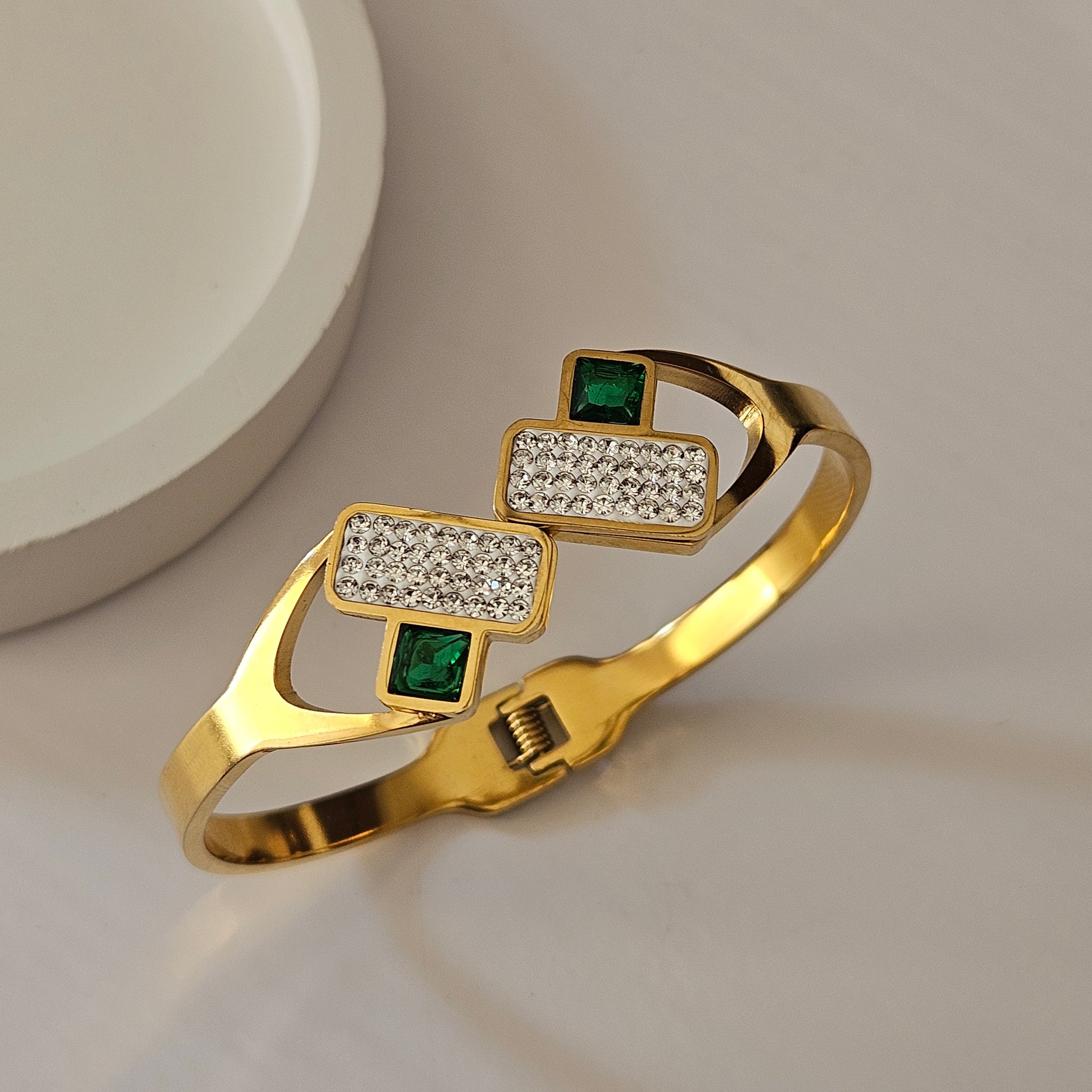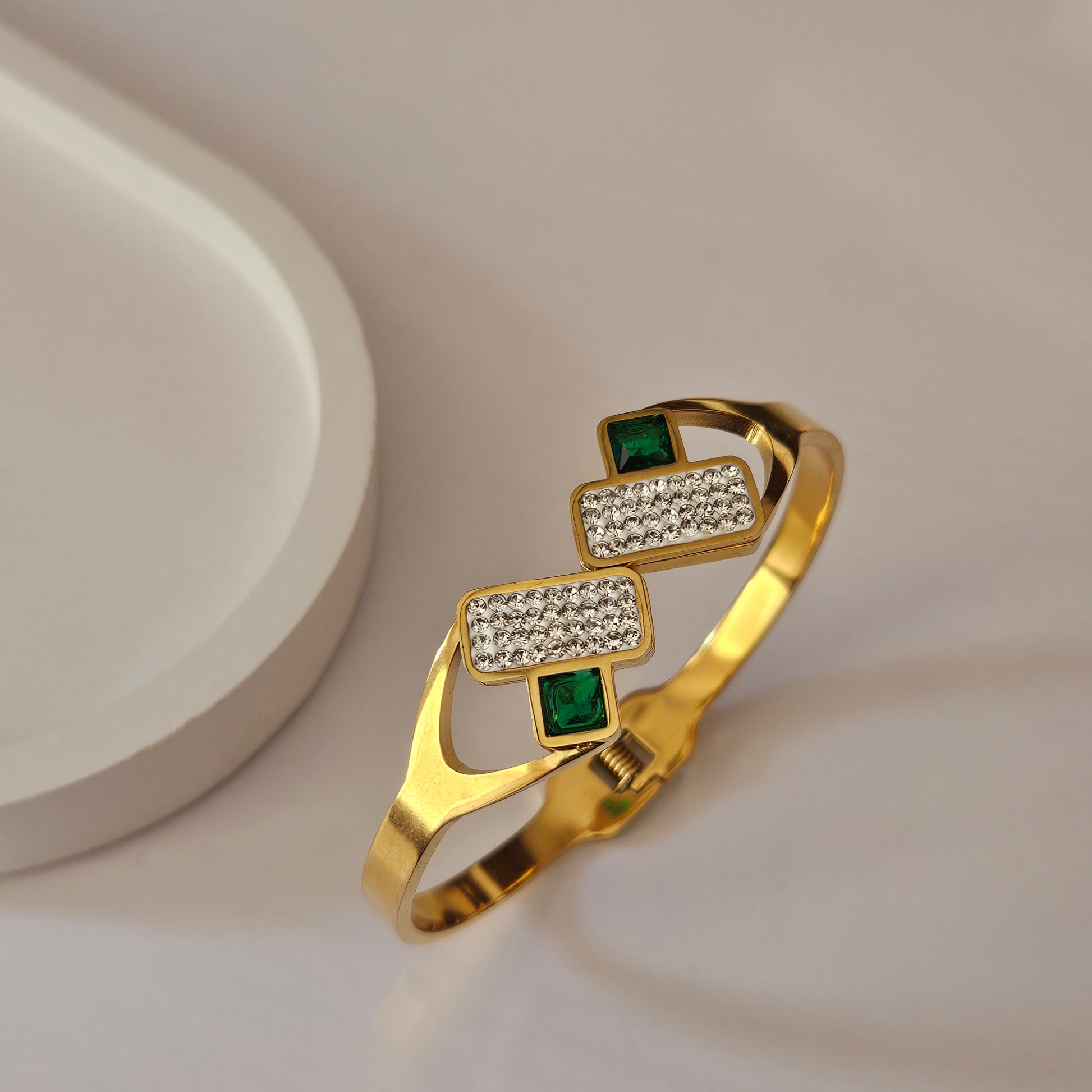 Add a touch of contemporary elegance to your wrist with the Khloe Band. This stylish bracelet or kada offers a modern design, perfect for a chic everyday look. Crafted with anti-tarnish properties.