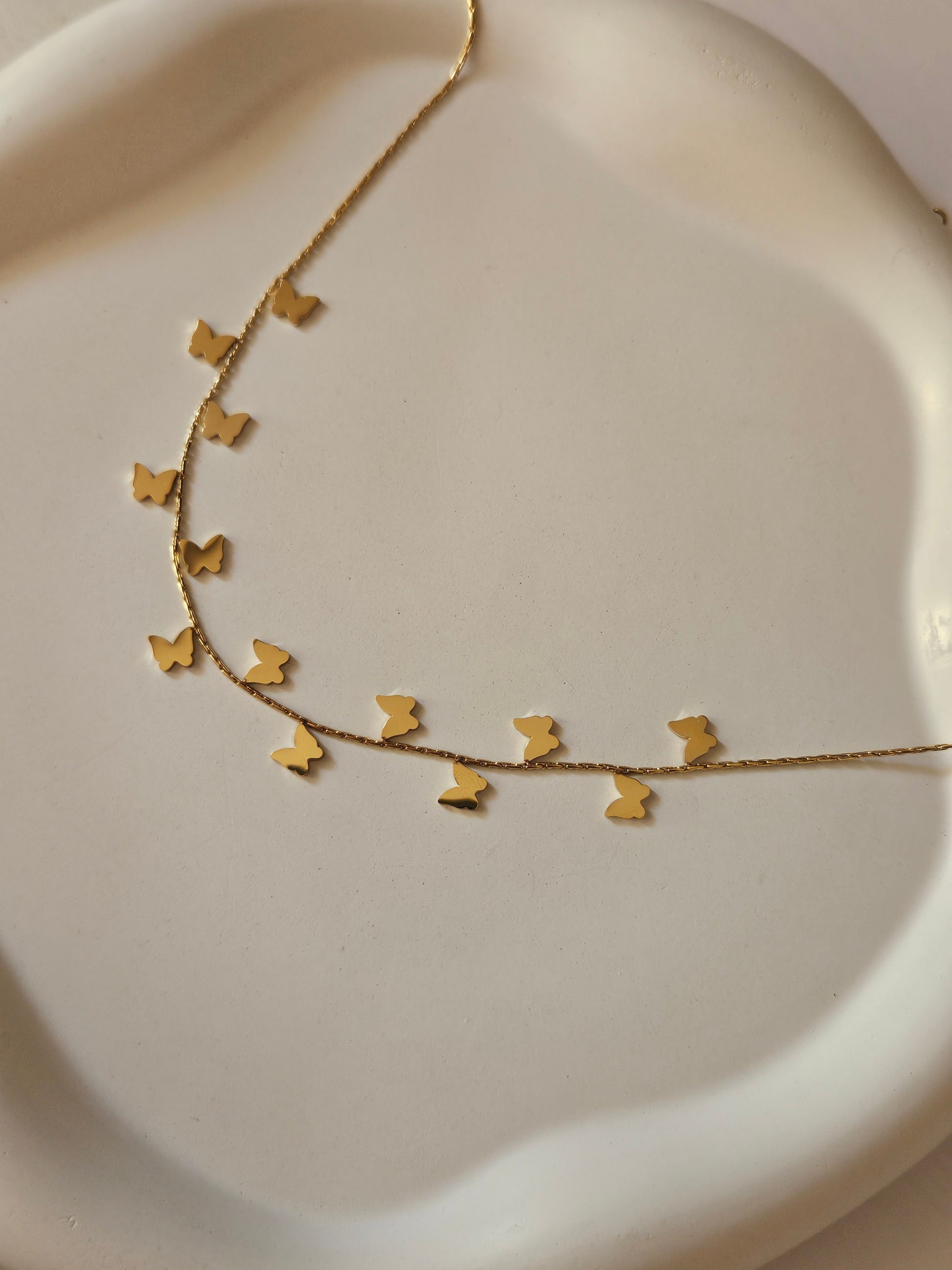Flutter with grace with the Kocho Necklace. This delicate neckchain features an intricate butterfly-inspired design, perfect for adding a touch of whimsical elegance to your look. Crafted with anti-tarnish properties.
