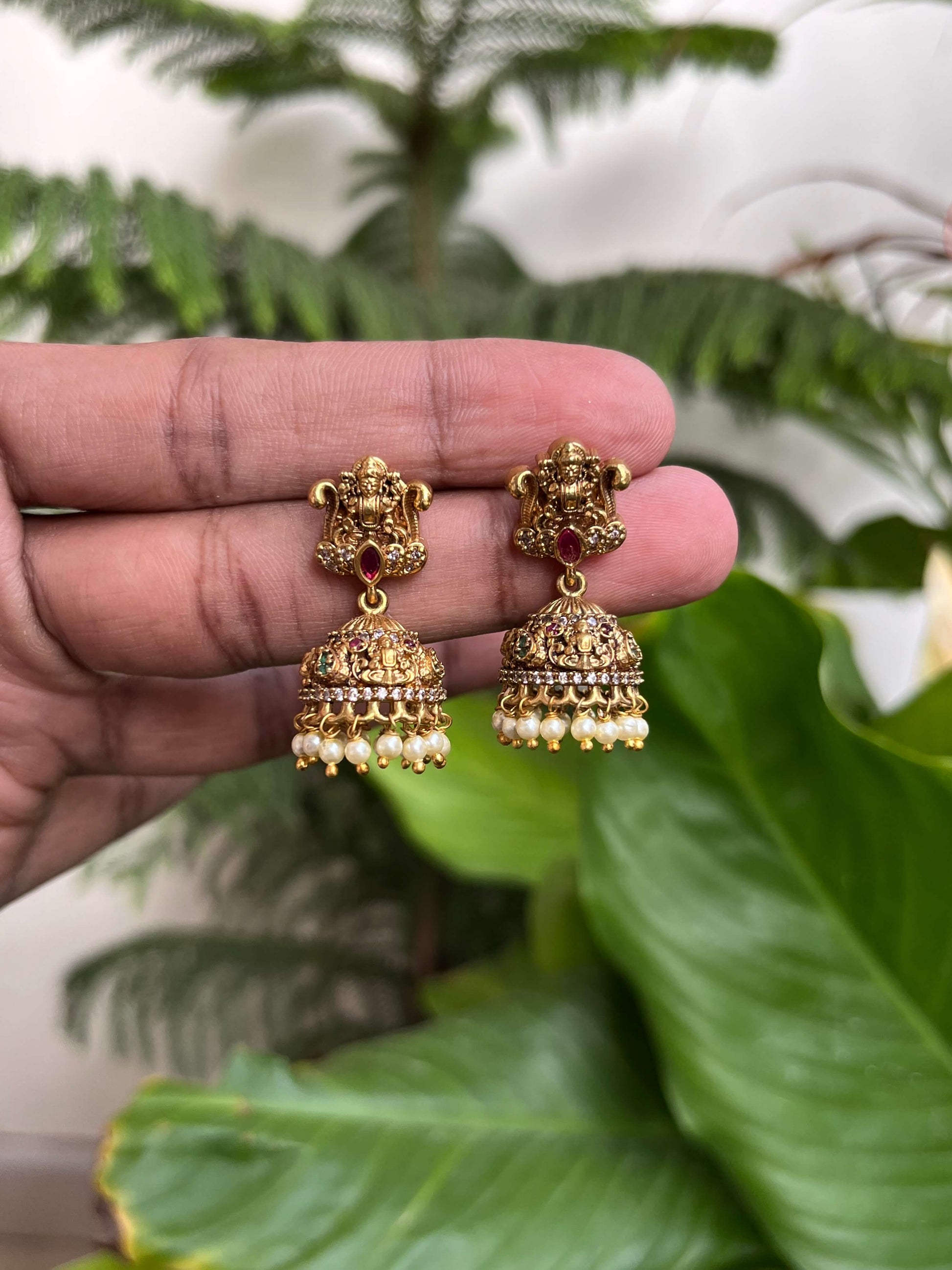 Traditional Nakshi Jhumka Earrings with Pearl Drops – Antique Gold Temple Jewellery