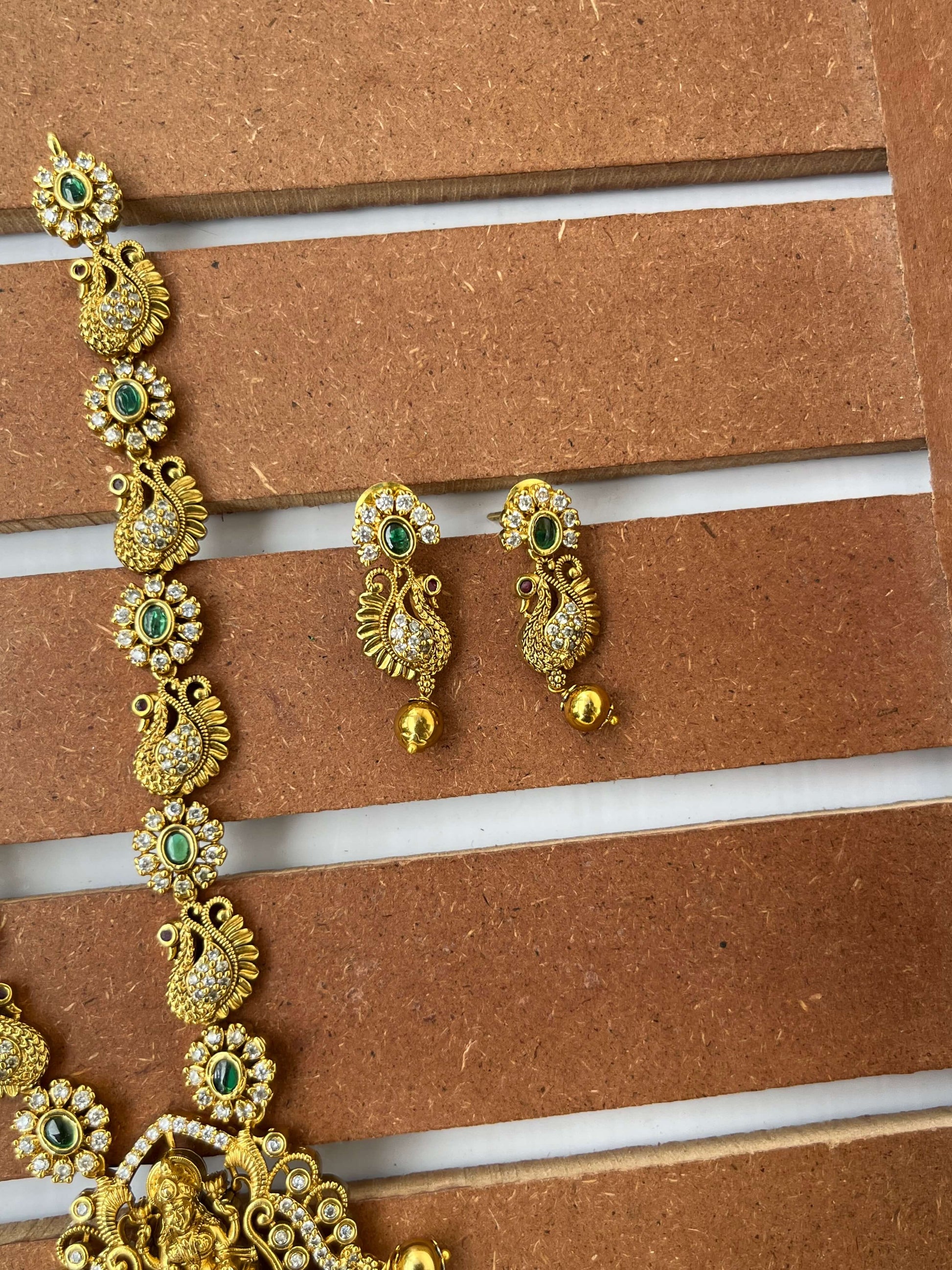 Lakshmi Devi Peacock Motif Necklace with CZ & Emerald Green Stones