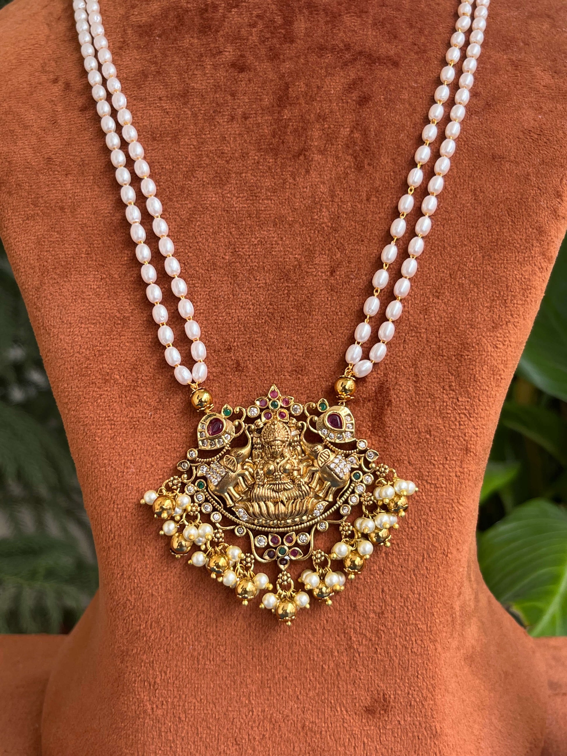 Lakshmi Devi Pendant Haram with Elephant Motif | 2-Line Rice Pearl Necklace | Temple Jewellery Style