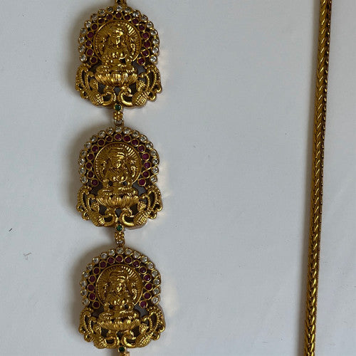Elevate your traditional ensemble with the Lakshmi Devi Side Chain, a finely crafted accessory that embodies grace and cultural heritage. Expertly designed to complement sarees and ethnic wear, this side chain features intricate detailing inspired by the goddess Lakshmi, symbolizing prosperity and auspiciousness. Its secure fit and elegant design enhance your attire while offering comfort for extended wear. Perfect for festive occasions and weddings, this piece adds a refined touch of spirituality and style to your jewelry collection.