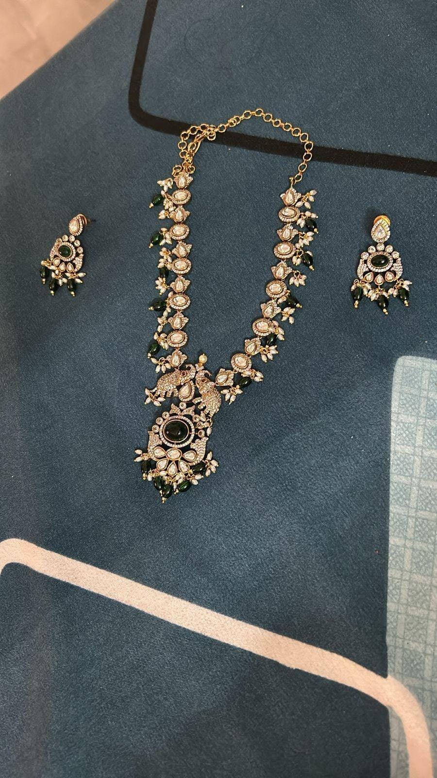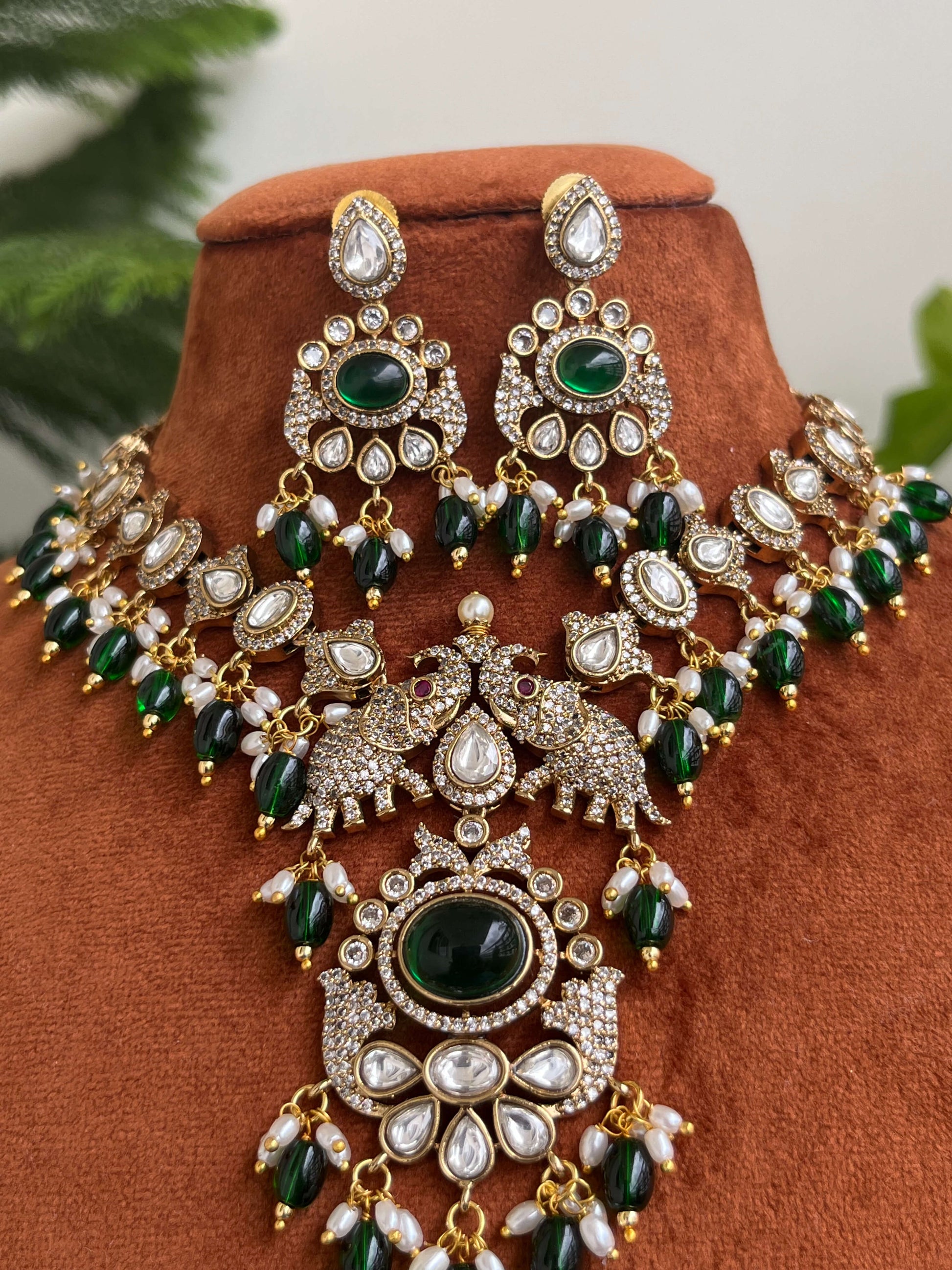 Exude royalty with this exquisite choker-style necklace set, embellished with dazzling moissanite and kundan stones. The intricate design features twin elephant motifs for a touch of grandeur, while the green Monalisa beads and delicate rice pearls add graceful movement and charm. Designed to perfection for modern brides and festive occasions, this designer set comes with matching earrings — all at an affordable price without compromising on luxury.
