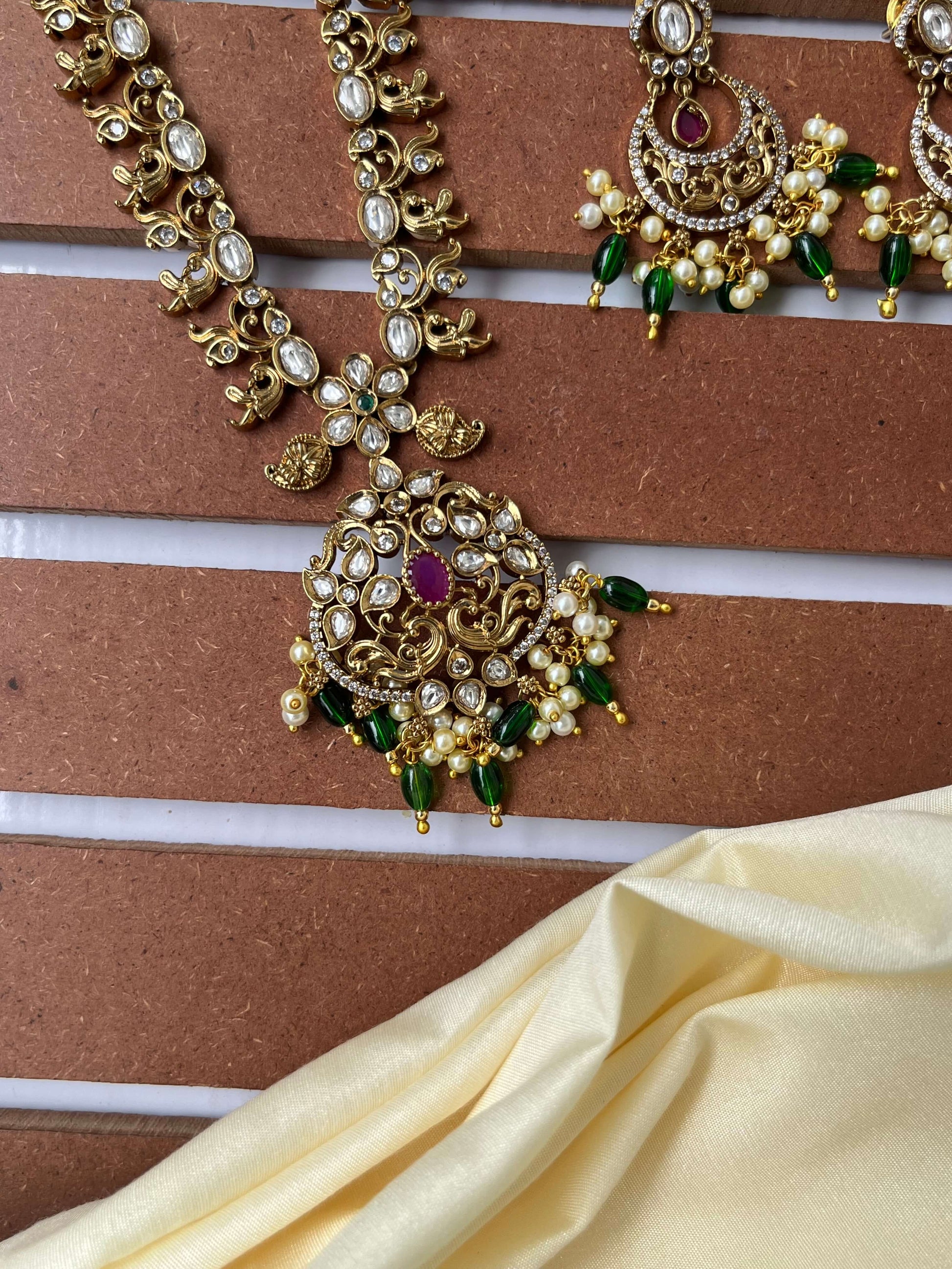 This stunning mehendi polish short necklace set is beautifully Kundan studded and paired with matching chaandbali earrings. Designed with graceful Monalisa beads, it is available in two elegant variants – green and pink. Perfect for weddings, festive occasions, and traditional celebrations.