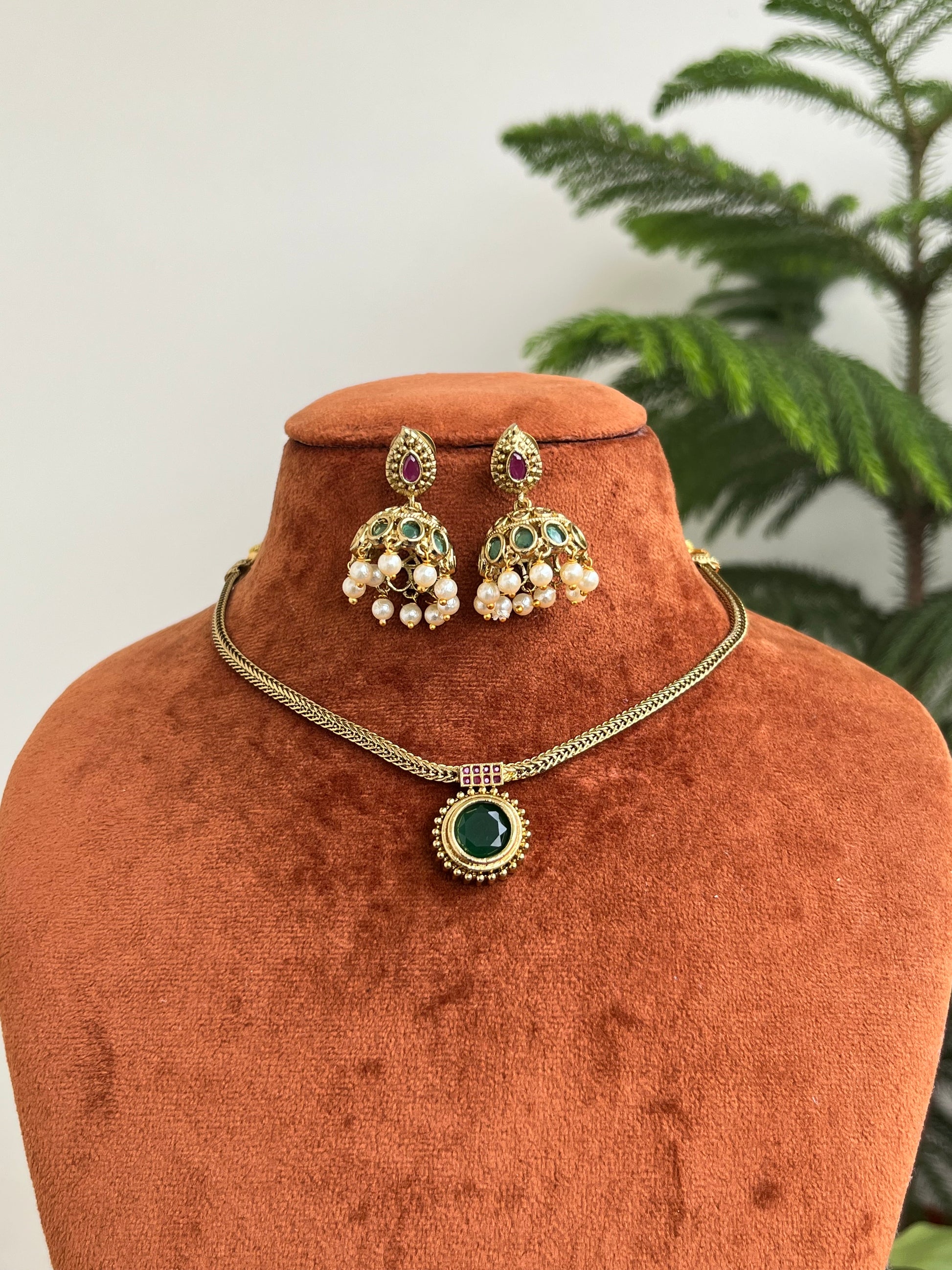 The necklace features a delicate Attigai design with a rich antique Victorian polish, highlighted with green and red stones that bring out a royal charm. The matching jhumka earrings are embellished with pearls and stones, giving them a graceful and ethnic finish. Whether you are dressing up for a wedding, festival, or a casual traditional gathering, this necklace set will elevate your outfit effortlessly.
