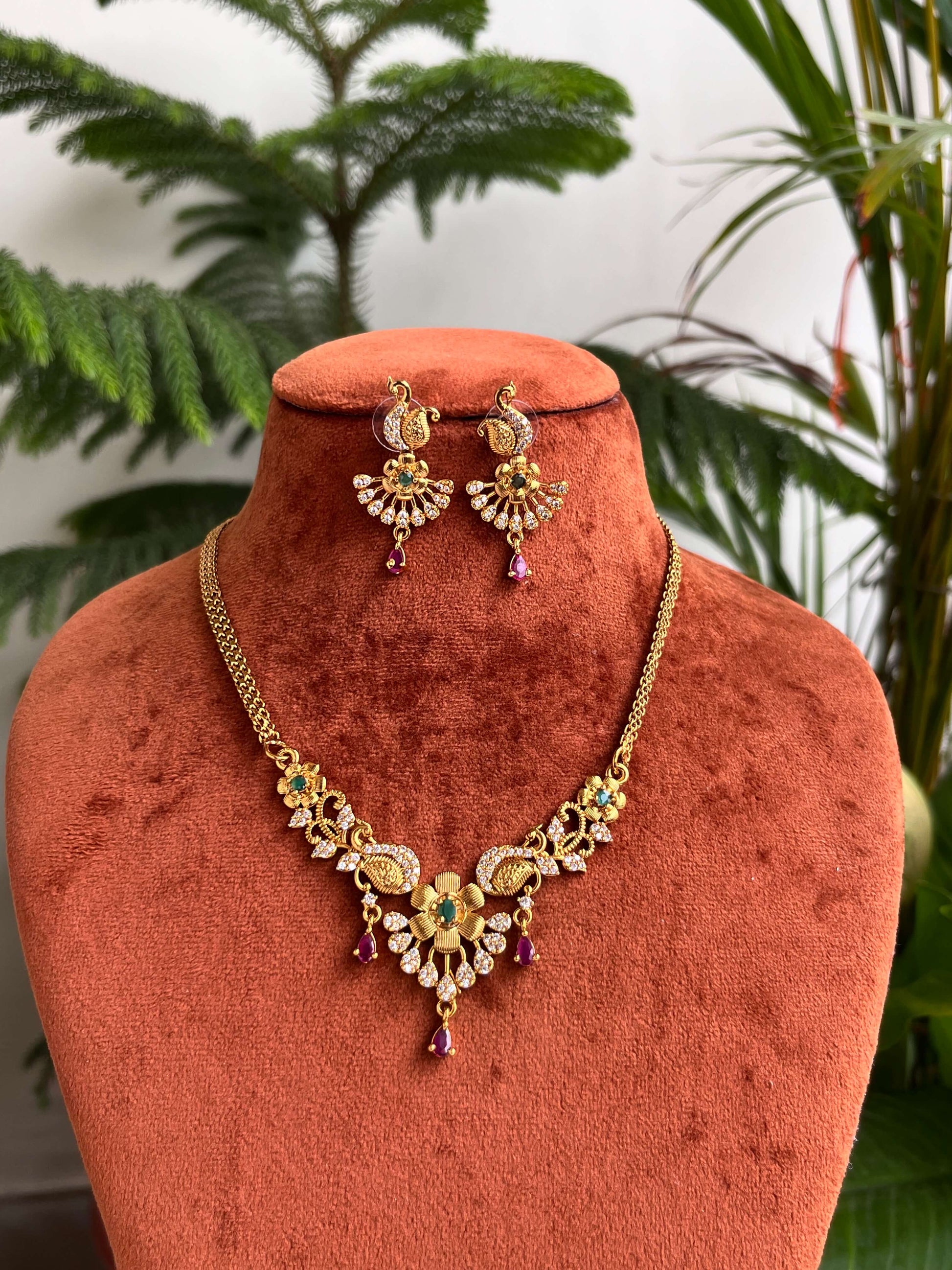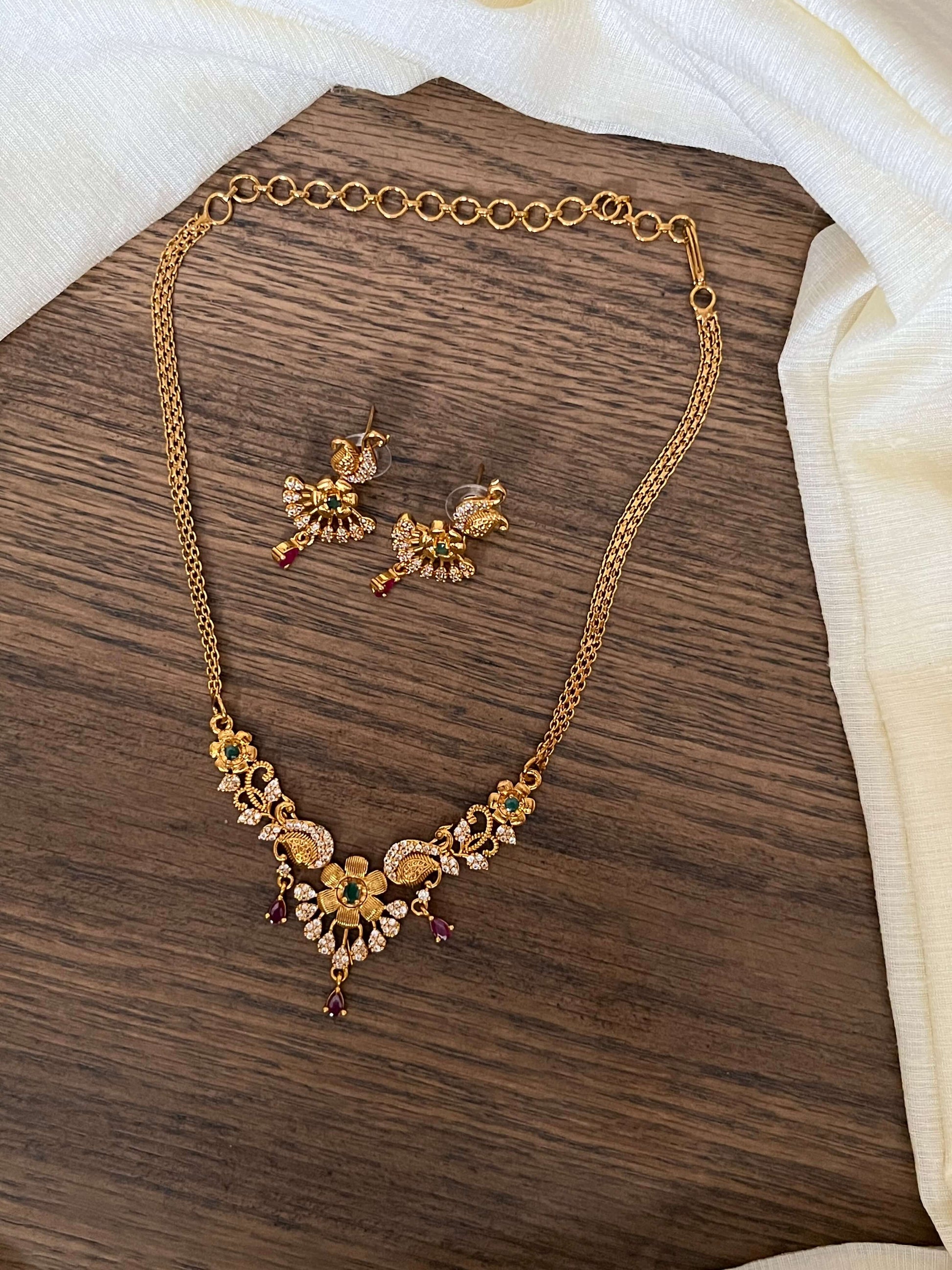 Enhance your style with this Minimal Matte Finish Necklace Set, a perfect blend of elegance and affordability. Crafted with precision, this necklace is designed with a delicate floral motif, green and ruby accents, and shimmering CZ stones, making it an ideal choice for women who love subtle yet classy jewelry.