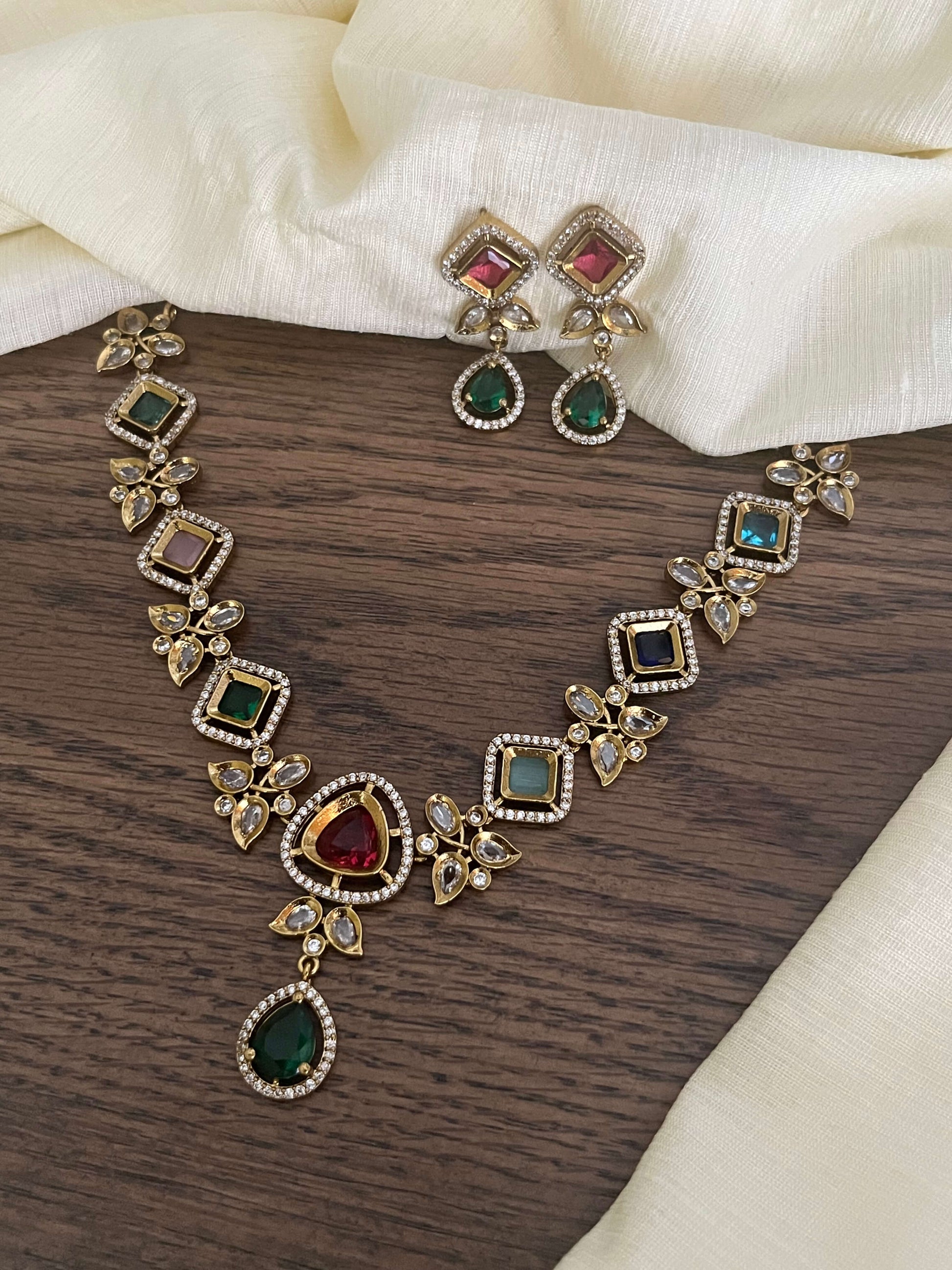 Celebrate colors, culture, and class with our exquisite multi-colored stone necklace set, perfect for weddings, festive events, and gifting. This gold-finish necklace features premium quality square and teardrop stones in vibrant hues — emerald green, ruby red, sapphire blue, and more — making it a versatile match for every outfit.