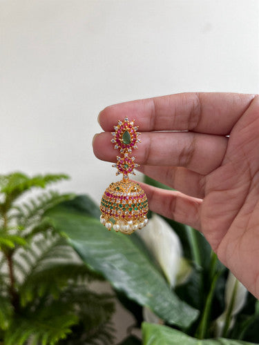 These Multicolor Studded Jhumka Earrings blend traditional charm with vibrant hues, making them a versatile accessory for various occasions. Expertly crafted, their intricate studded design enhances the earrings' texture and visual appeal, while the multicolor elements add a lively touch to your ensemble. Perfect for elevating both ethnic and contemporary outfits, these earrings offer a refined statement of style and craftsmanship.