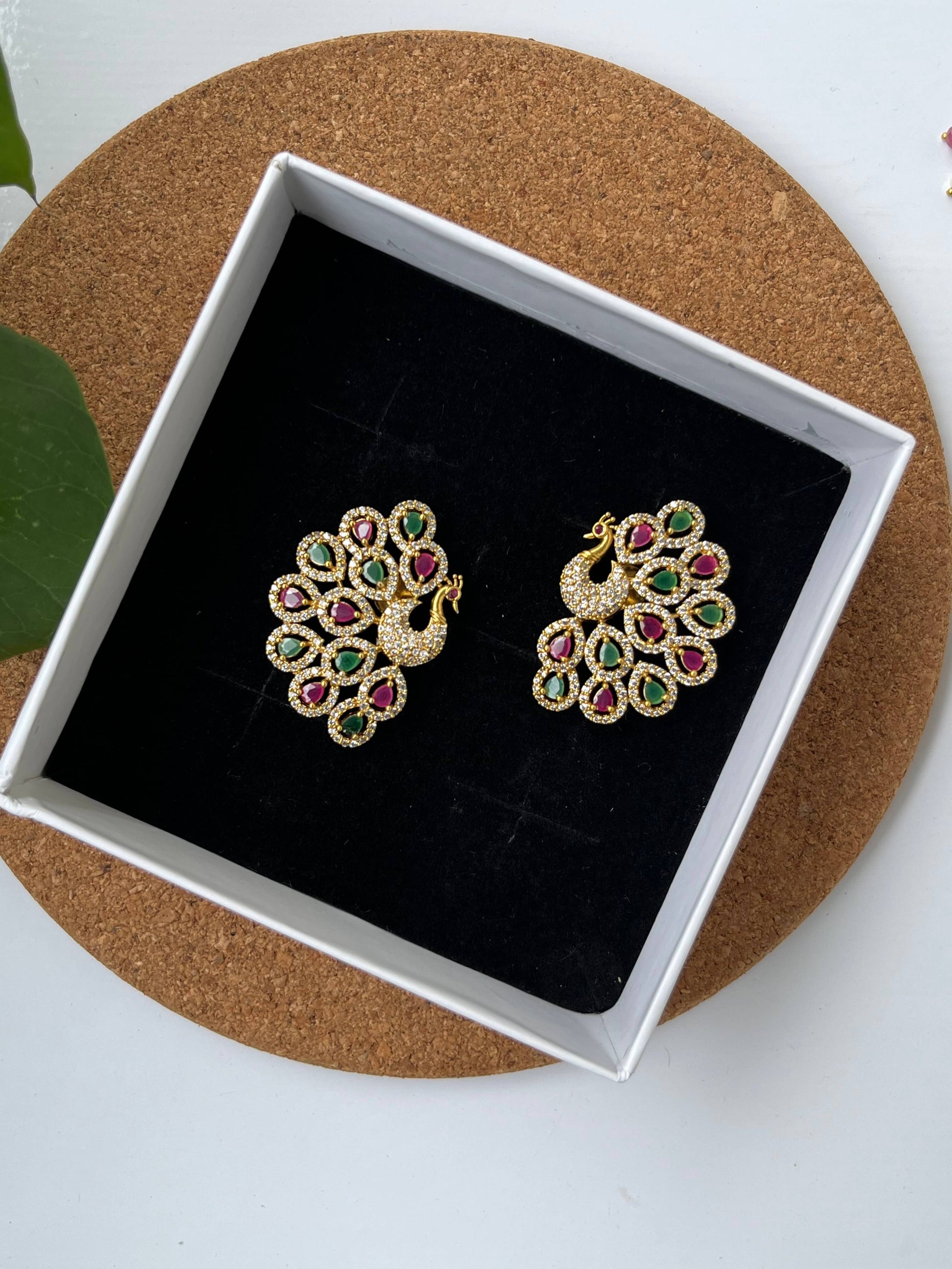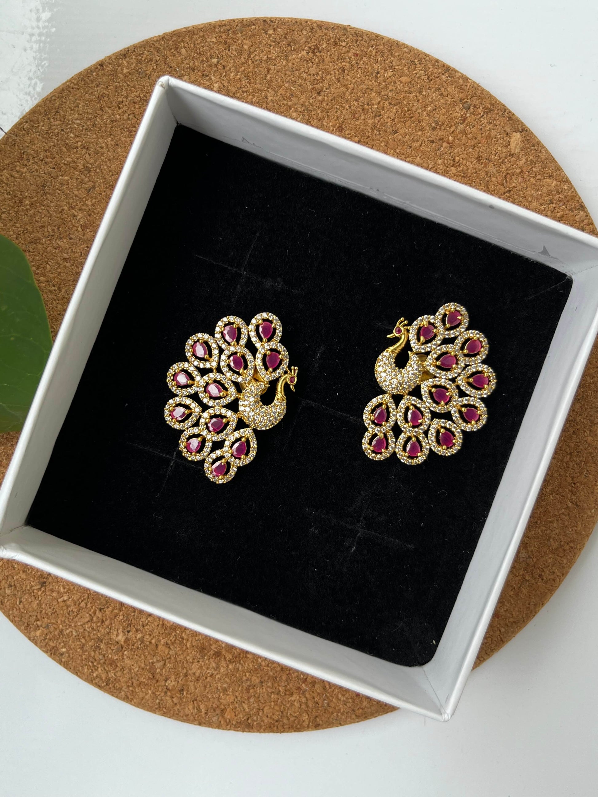 Elevate your style with our Peacock Stud Earrings, a stunning blend of tradition and elegance. Designed in an intricate peacock motif, these earrings feature dazzling American diamonds, vibrant multicolor stones, and a rich ruby red option.