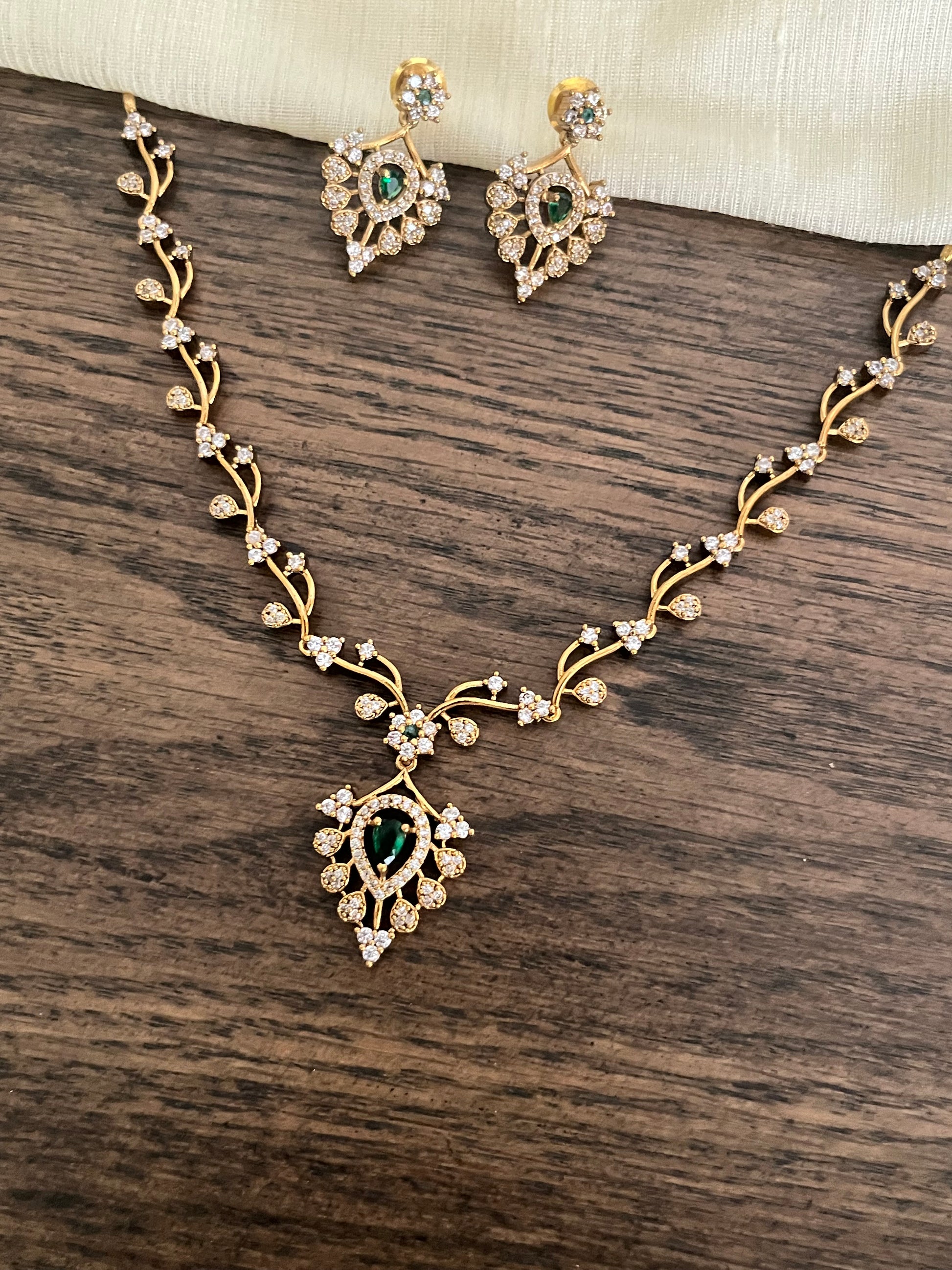 Sleek Green AD Necklace – Leaf Motifs – With Earrings