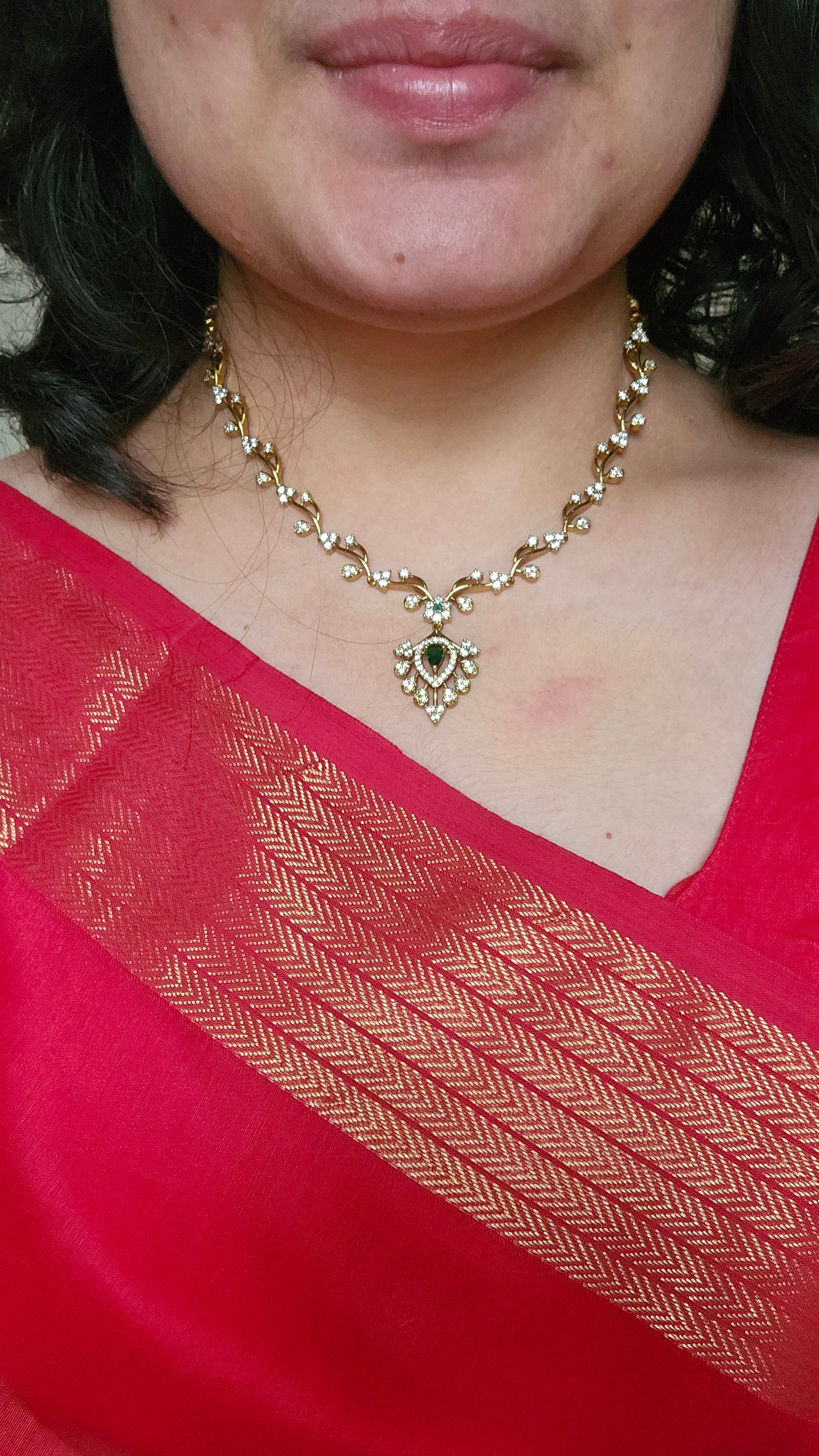 This sleek green necklace is delicately studded with artificial diamonds (AD) and designed with elegant leaf motifs, creating a beautiful fusion of traditional charm and modern minimalism.