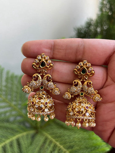 Elevate your traditional collection with these expertly crafted Studded Peacock Motif Jhumkas. Featuring intricate peacock designs adorned with sparkling stones, these earrings blend artistry with elegance. Their lightweight structure ensures comfortable wear, making them perfect for festive occasions or weddings. A timeless accessory that highlights craftsmanship and cultural heritage.