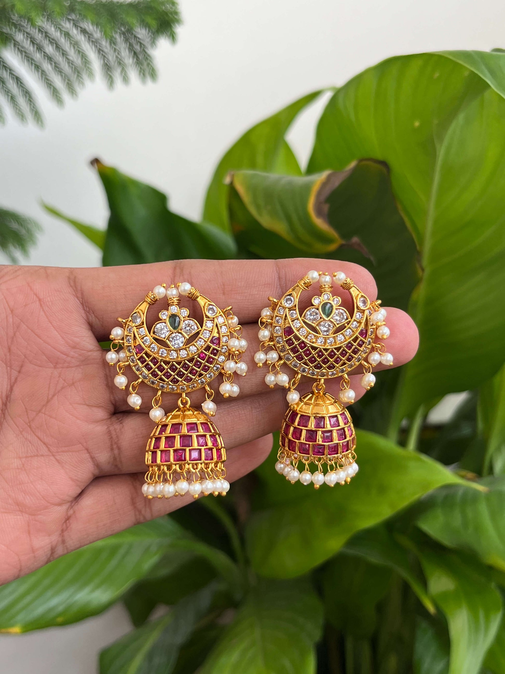 Add a royal touch to your ethnic look with these stunning traditional Kemp earrings. Handcrafted with intricate detailing, these gold-toned jhumka earrings feature vibrant ruby red stones, dazzling white CZ stones, and delicate pearl danglings for a rich temple jewelry aesthetic. Perfect for weddings, festive occasions, or gifting, these statement earrings complement sarees, lehengas, and traditional attire beautifully.