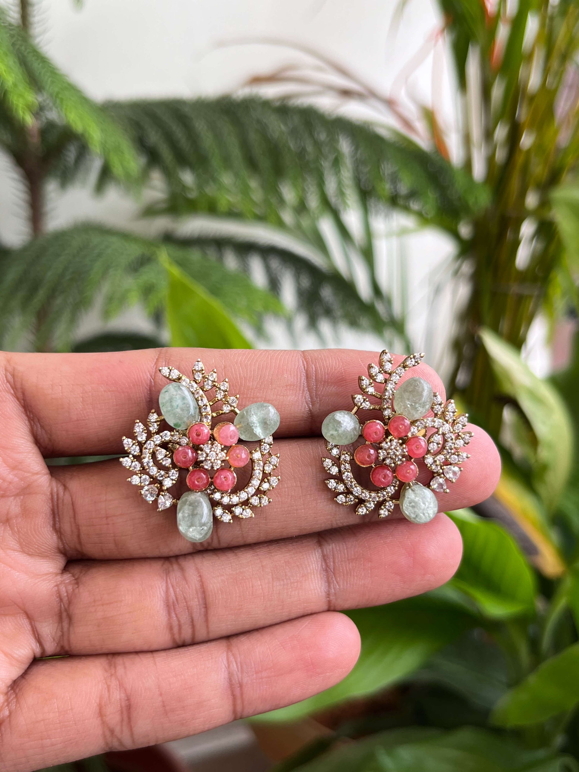 - Stones: Coral beads, green jade drops, premium CZ stones