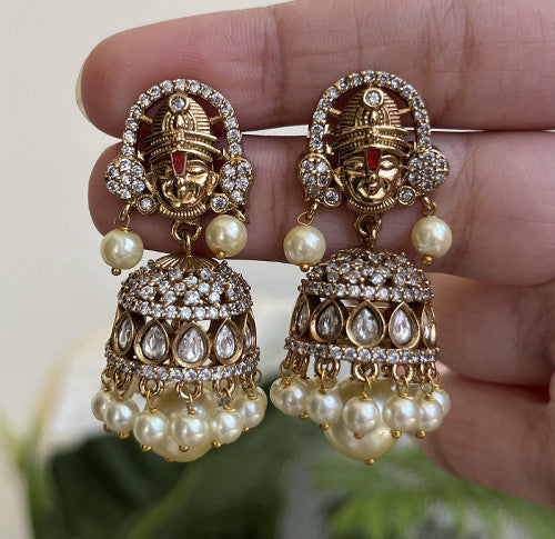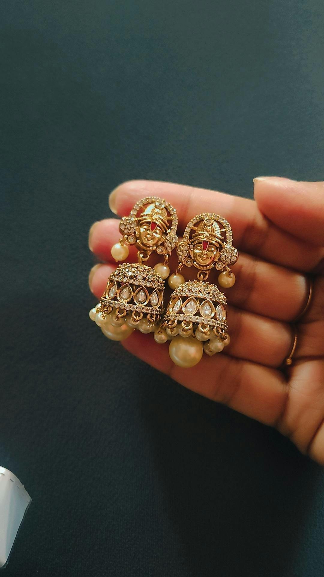 The Venkateshwara Swamy Victorian Jhumka blends traditional Indian craftsmanship with Victorian elegance, offering a unique statement piece. Expertly crafted, these earrings feature intricate detailing that highlights cultural artistry while providing a timeless appeal. Perfect for enhancing formal attire, they bring a refined touch to any ensemble, reflecting both heritage and sophistication.