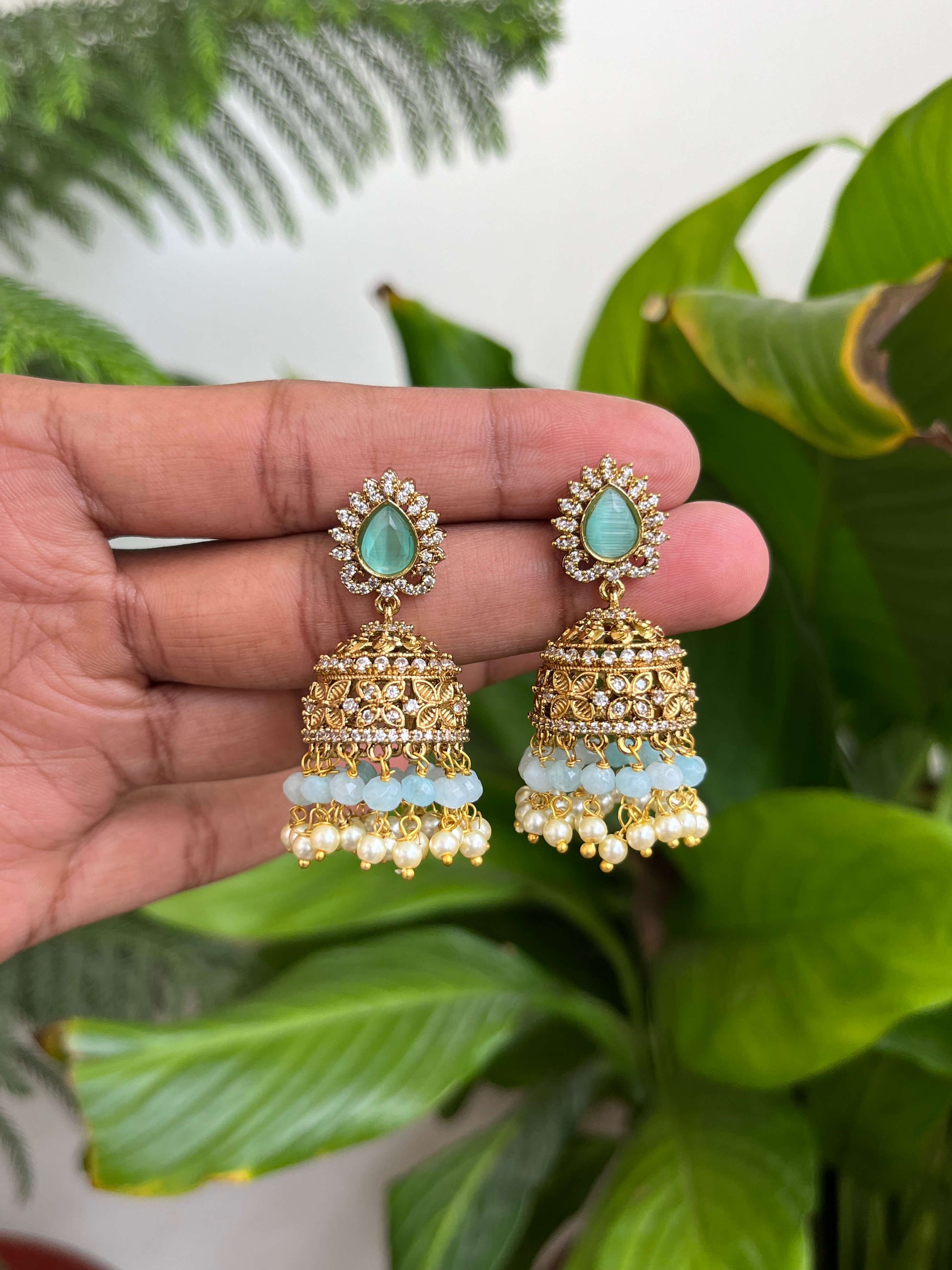 Add timeless charm to your ethnic look with these Victorian-style jhumka earrings, beautifully adorned with sparkling CZ stones, onyx beads, and delicate pearl drops. The intricate gold-finish dome features floral motifs that perfectly blend tradition with trend. Lightweight yet statement-making, these earrings come in three stunning colors – pink, mint, and green – to match any outfit or occasion.