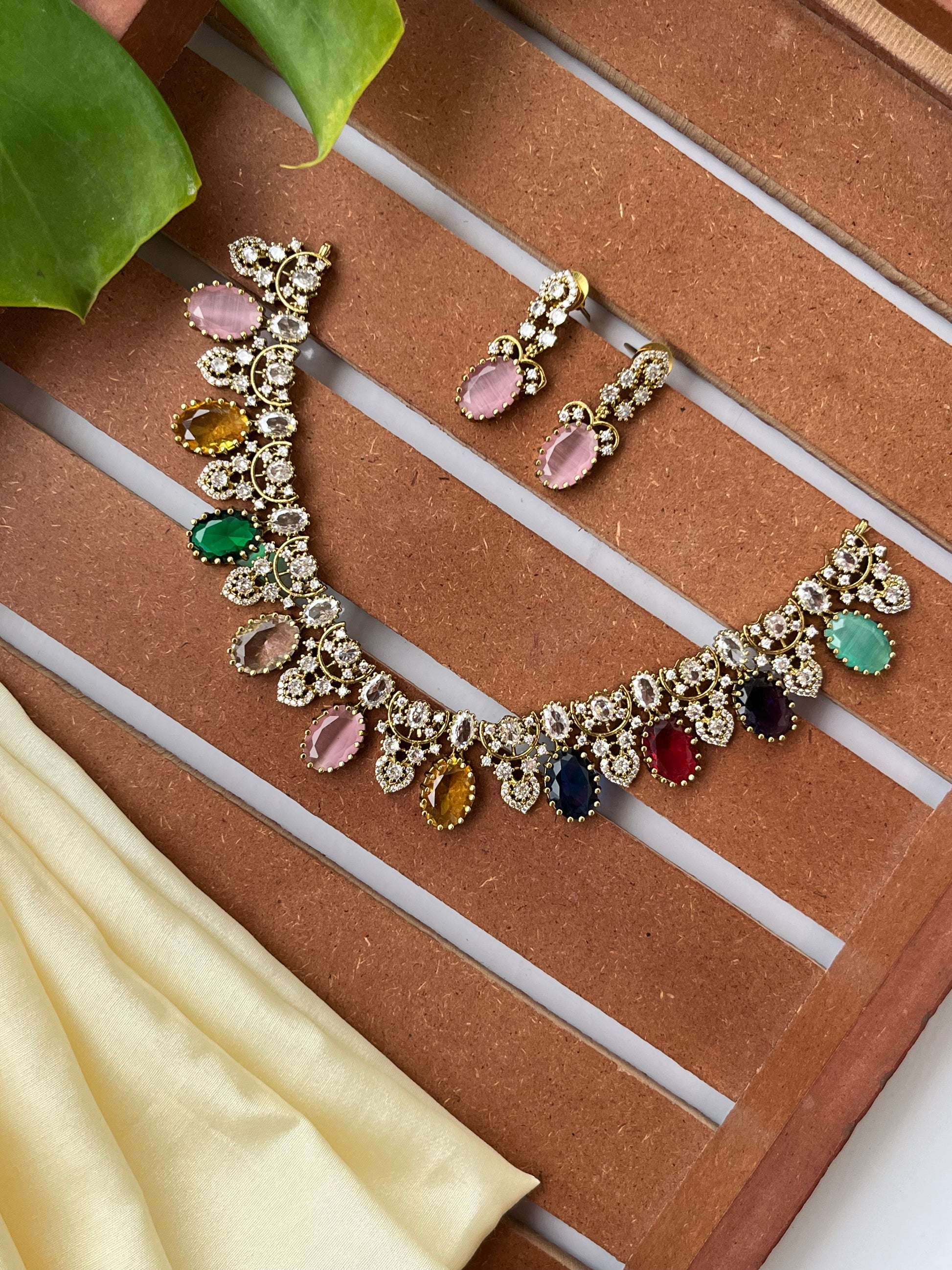 Bring a regal charm to your collection with this Victorian Multicolor Necklace Set. Adorned with vibrant stones in pink, green, yellow, blue, and white, this necklace is crafted with premium plating for a luxurious finish.