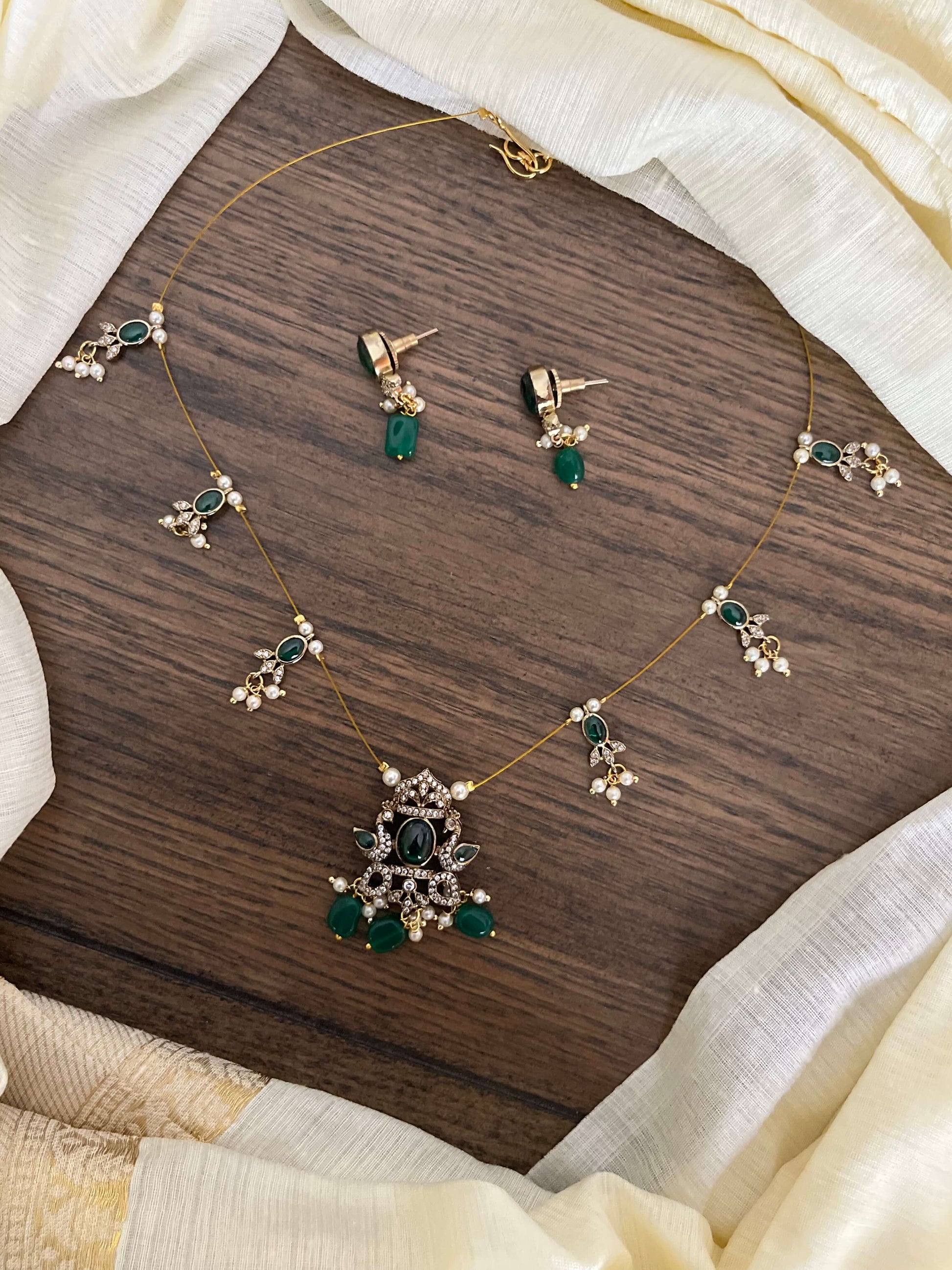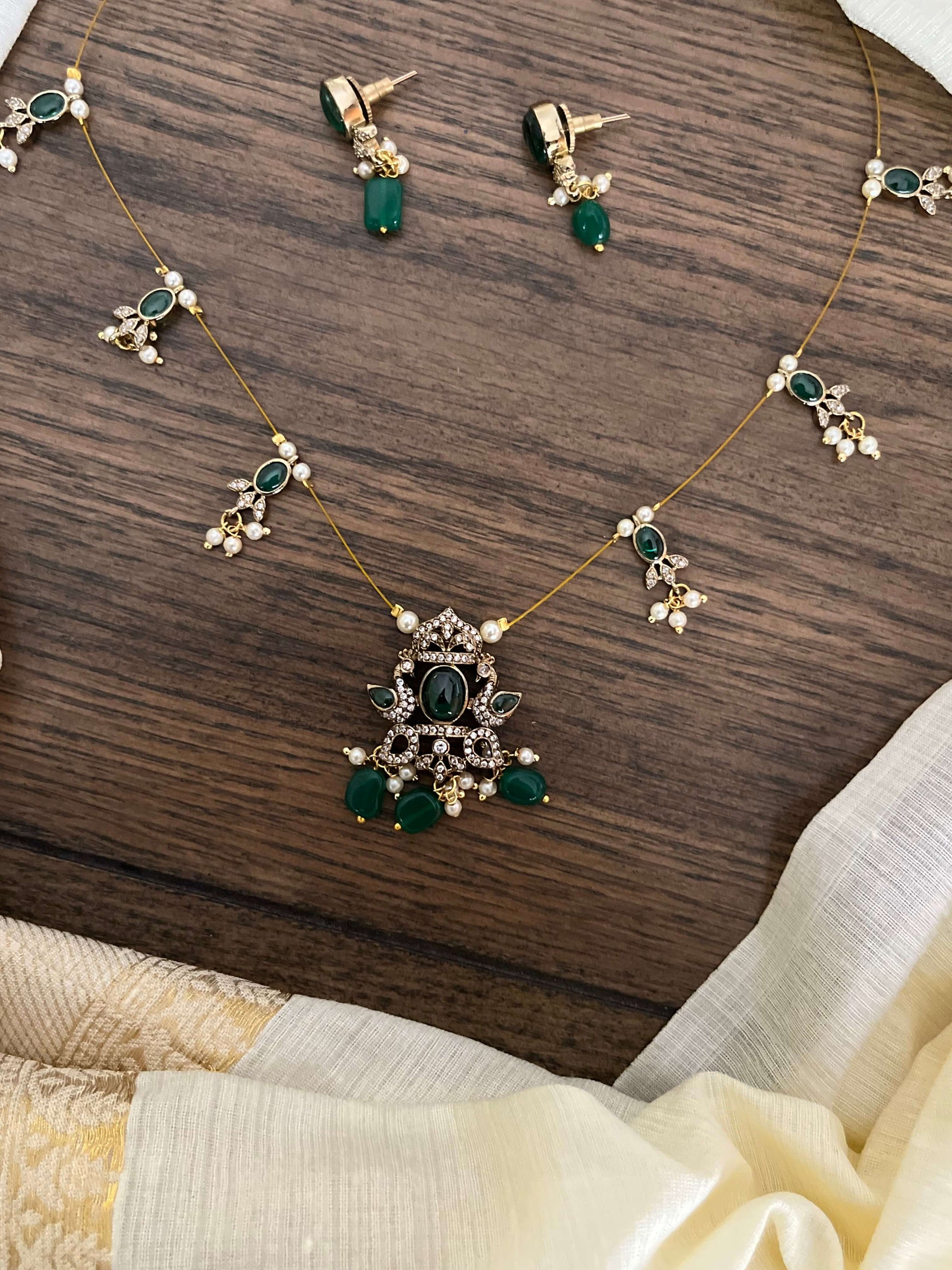 Victorian Peacock Motif Invisible Chain Necklace Set with Earrings – Green & Purple Variants