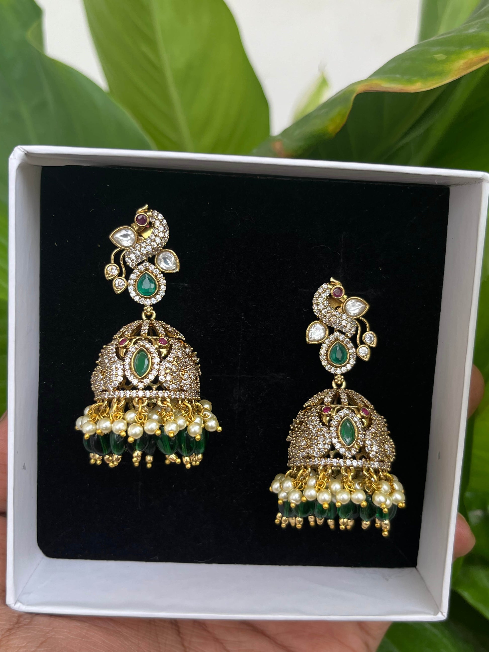 Make a bold style statement with our Victorian Peacock Motif Long Jhumkas, available in three regal shades – green, mint, and ruby. Featuring intricate peacock designs and a majestic long drop silhouette, these earrings are part of our luxury collection – perfect for bridesmaids, wedding guests, or anyone wanting to stand out.