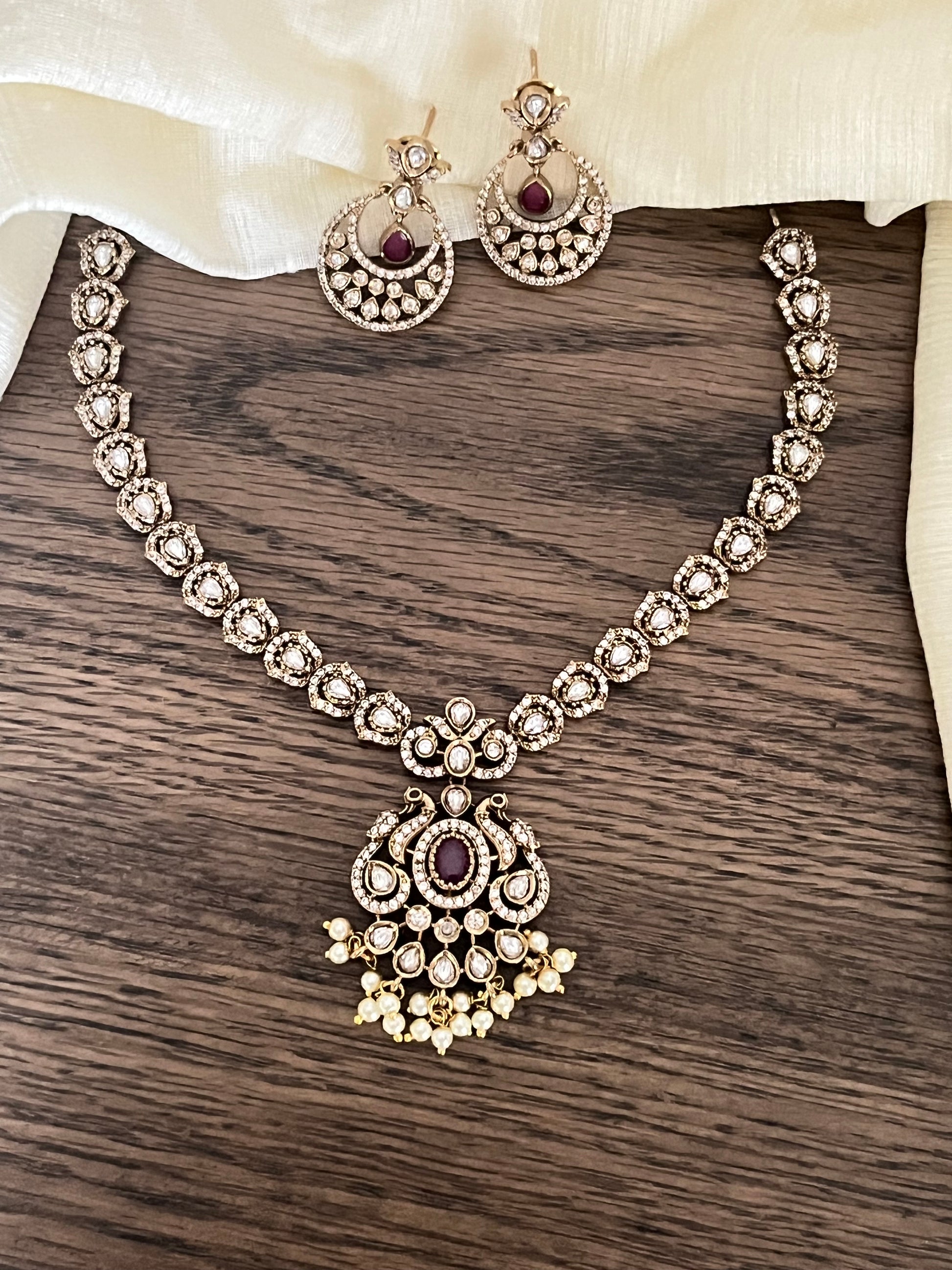 Victorian Peacock Necklace Set with Kundan Stones & Pearl Drops